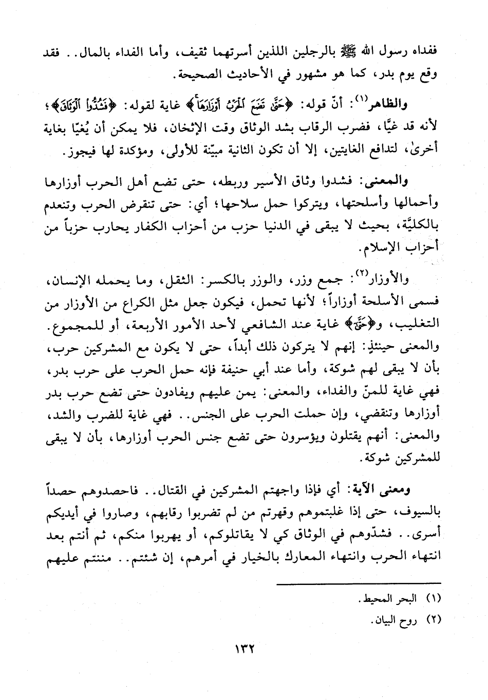 والمعنى: فشدوا وثاق الأسير وربطه، حتى تضع أهل الحرب أوزارها وأحمالها وأسلحتها، ويتركوا حمل سلاحها؛ أي: حتى تنقرض الحرب وتنعدم بالكليَّة، بحيث لا يبقى في الدنيا حزب من أحزاب الكفار يحارب حزبًا من أحزاب الإِسلام.