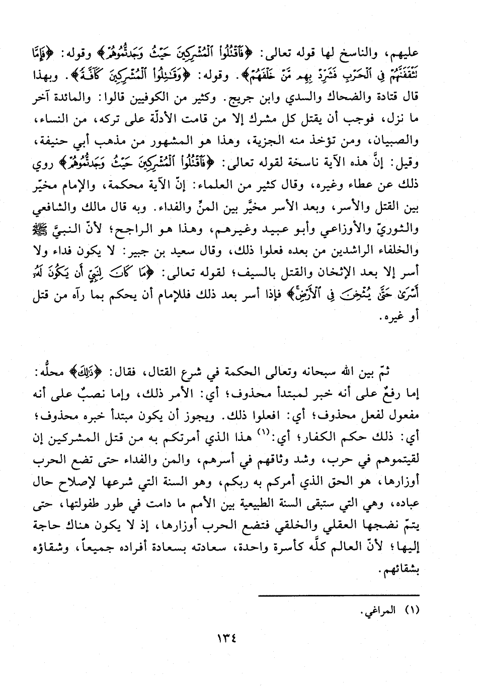عليهم، والناسخ لها قوله تعالى: {فَاقْتُلُوا الْمُشْرِكِينَ حَيْثُ وَجَدْتُمُوهُمْ} وقوله: {فَإِمَّا تَثْقَفَنَّهُمْ فِي الْحَرْبِ فَشَرِّدْ بِهِمْ مَنْ خَلْفَهُمْ}. وقوله: {وَقَاتِلُوا الْمُشْرِكِينَ كَافَّةً}. وبهذا قال قتادة والضحاك والسدي وابن جريج. وكثير من الكوفيين قالوا: والمائدة آخر ما نزل، فوجب أن يقتل كل مشرك إلا من قامت الأدلّة على تركه، من النساء، والصبيان، ومن تؤخذ منه الجزية، وهذا هو المشهور من مذهب أبي حنيفة، وقيل: إنَّ هذه الآية ناسخة لقوله تعالى: {فَاقْتُلُوا الْمُشْرِكِينَ حَيْثُ وَجَدْتُمُوهُمْ} روي ذلك عن عطاء وغيره، وقال كثير من العلماء: إنّ الآية محكمة، والإمام مخيّر بين القتل والأسر، وبعد الأسر مخيَّر بين المنِّ والفداء. وبه قال مالك والشافعي والثوريّ والأوزاعي وأبو عبيد وغيرهم، وهذا هو الراجح؛ لأنّ النبيَّ - صلى الله عليه وسلم - والخلفاء الراشدين من بعده فعلوا ذلك، وقال سعيد بن جبير: لا يكون فداء ولا أسر إلا بعد الإثخان والقتل بالسيف؛ لقوله تعالى: {مَا كَانَ لِنَبِيٍّ أَنْ يَكُونَ لَهُ أَسْرَى حَتَّى يُثْخِنَ فِي الْأَرْضِ} فإذا أسر بعد ذلك فللإمام أن يحكم بما رآه من قتل أو غيره.