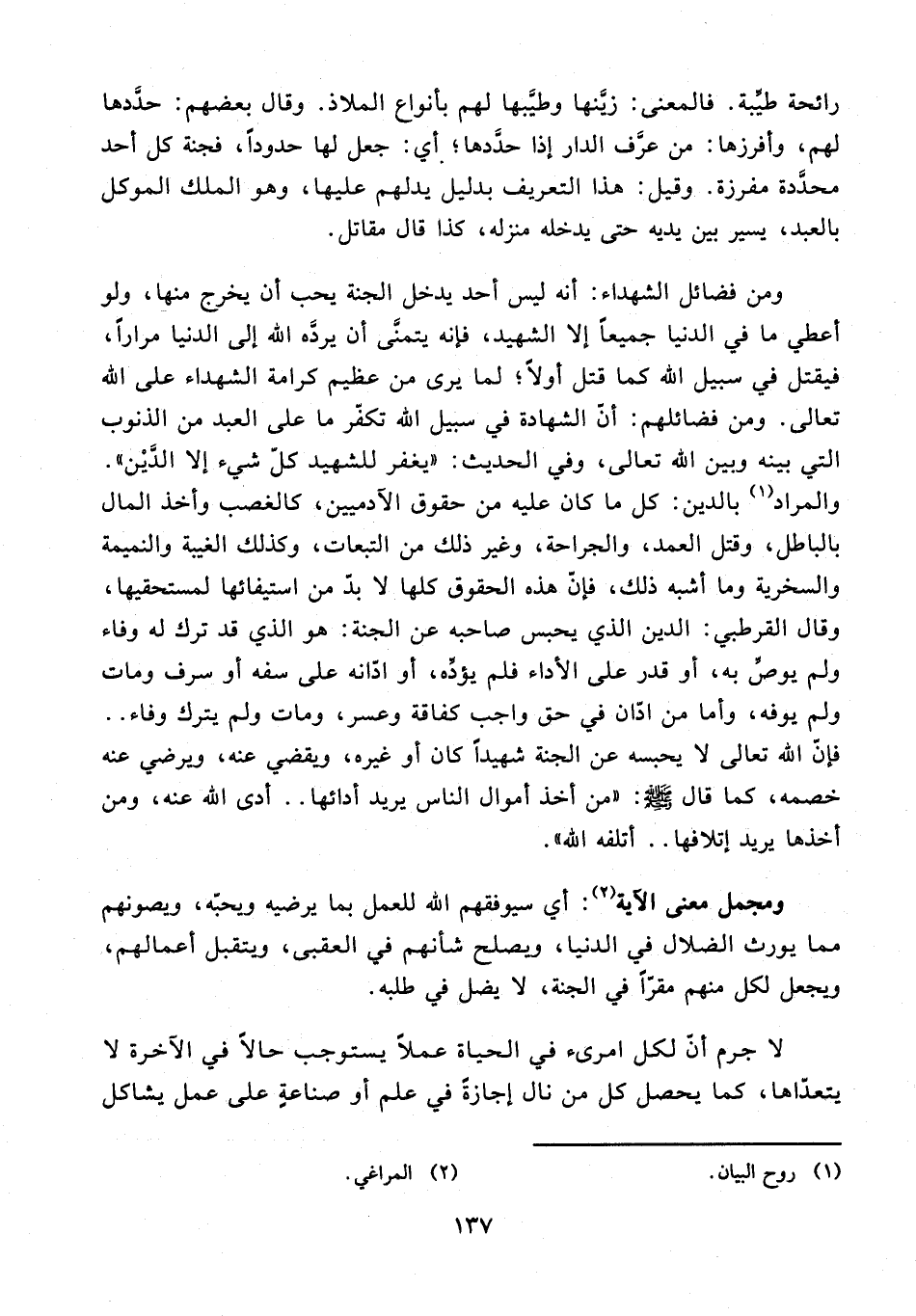 ومجمل معنى الآية (¬2): أي سيوفقهم الله للعمل بما يرضيه ويحبّه، ويصونهم مما يورث الضلال في الدنيا، ويصلح شأنهم في العقبى، ويتقبل أعمالهم، ويجعل لكل منهم مقرًّا في الجنة، لا يضل في طلبه.