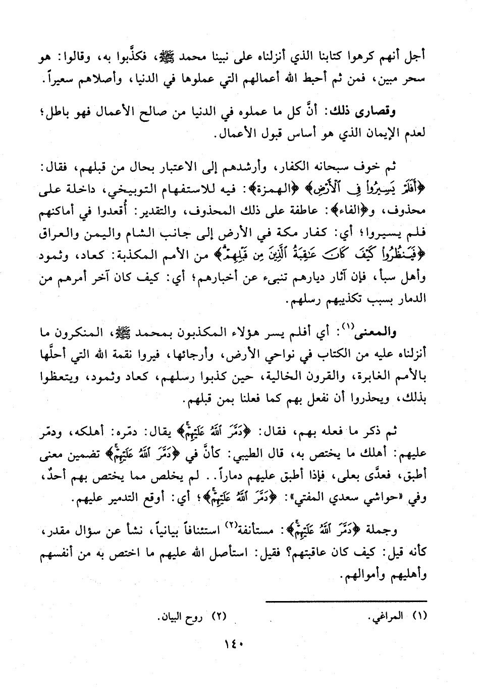 10 - ثم خوف سبحانه الكفار، وأرشدهم إلى الاعتبار بحال من قبلهم، فقال: {أَفَلَمْ يَسِيرُوا فِي الْأَرْضِ} {الهمزة}: فيه للاستفهام التوبيخي، داخلة على محذوف، و {الفاء}: عاطفة على ذلك المحذوف، والتقدير: أُقعدوا في أماكنهم فلم يسيروا؛ أي: كفار مكة في الأرض إلى جانب الشام واليمن والعراق {فَيَنْظُرُوا كَيْفَ كَانَ عَاقِبَةُ الَّذِينَ مِنْ قَبْلِهِمْ} من الأمم المكذبة: كعاد، وثمود وأهل سبأ، فإن آثار ديارهم تنبىء عن أخبارهم؛ أي: كيف كان آخر أمرهم من الدمار بسبب تكذيبهم رسلهم.