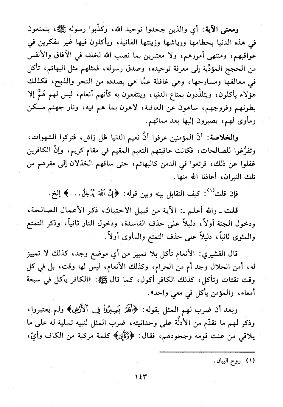 قال القشيري: الأنعام تأكل بلا تمييز من أي موضع وجد، كذلك لا تمييز له، أمن الحلال وجد أم من الحرام، وكذلك الأنعام، ليس لها وقت، بل في كل وقت تقتات وتأكل، كذلك الكافر أكول، كما قال - صلى الله عليه وسلم -: "الكافر يأكل في سبعة أمعاء، والمؤمن يأكل في معي واحد".