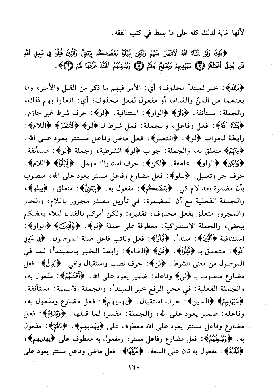 {ذَلِكَ}: خبر لمبتدأ محذوف؛ أي: الأمر فيهم ما ذكر من القتل والأسر، وما بعدهما من المنّ والفداء، أو مفعول لفعل محذوف؛ أي: افعلوا بهم ذلك، والجملة: مستأنفة. {وَلَوْ} {الواو}: استئنافية. {لو}: حرف شرط غير جازم. {يَشَاءُ اللَّهُ}: فعل وفاعل، والجملة: فعل شرط لـ {لو} {لَانْتَصَرَ} {اللام}: رابطة لجواب {لو}. {انتصر}: فعل ماض وفاعل مستتر يعود على الله. {مِنْهُمْ} متعلق به، والجملة: جواب {لو} الشرطية، وجملة {لو}: مستأنفة. {وَلَكِنْ} {الواو}: عاطفة. {لكن}: حرف استدراك مهمل. {لِيَبْلُو} {اللام}: حرف جر وتعليل. {يبلو}: فعل مضارع وفاعل مستتر يعود على الله، منصوب بأن مضمرة بعد لام كي. {بَعْضَكُمْ}: مفعول به. {بِبَعْضٍ}: متعلق بـ {يبلو} والجملة الفعلية مع أن المضمرة: في تأويل مصدر مجرور باللام، والجار والمجرور متعلق بفعل محذوف، تقديره: ولكن أمركم بالقتال لبلاء بعضكم ببعض، والجملة الاستدراكية: معطوفة على جملة {لو}. {وَالَّذِينَ} {الواو}: استئنافية {الَّذِينَ}: مبتدأ. {قُتِلُوا}: فعل ونائب فاعل صلة الموصول. {فِي سَبِيلِ اللَّهِ}: متعلق بـ {قُتِلُوا}. {فَلَنْ} {الفاء}: رابطة الخبر بالمبتدأ؛ لما في الموصول من معنى الشرط. {لن}: حرف نصب واستقبال ونفي. {يُضِلَّ}: فعل مضارع منصوب بـ {لن} وفاعله: ضمير يعود على الله. {أَعْمَالَهُمْ}: مفعول به، والجملة الفعلية: في محل الرفع خبر المبتدأ، والجملة الاسمية: مستأنفة. {سَيَهْدِيهِمْ} {السين}: حرف استقبال. {يَهْدِيهِمْ}: فعل مضارع ومفعول به، وفاعله: ضمير يعود على الله، والجملة: مفسرة لما قبلها. {وَيُصْلِحُ}: فعل مضارع وفاعل مستتر يعود على الله معطوف على {يَهْدِيهِمْ}. {بَالَهُمْ}: مفعول به. {وَيُدْخِلُهُمُ}: فعل مضارع وفاعل مستر، ومفعول به معطوف على {يَهْدِيهِمْ}، {الْجَنَّةَ}: مفعول به ثان على السعة. {عَرَّفَهَا}: فعل ماض وفاعل مستتر يعود على
