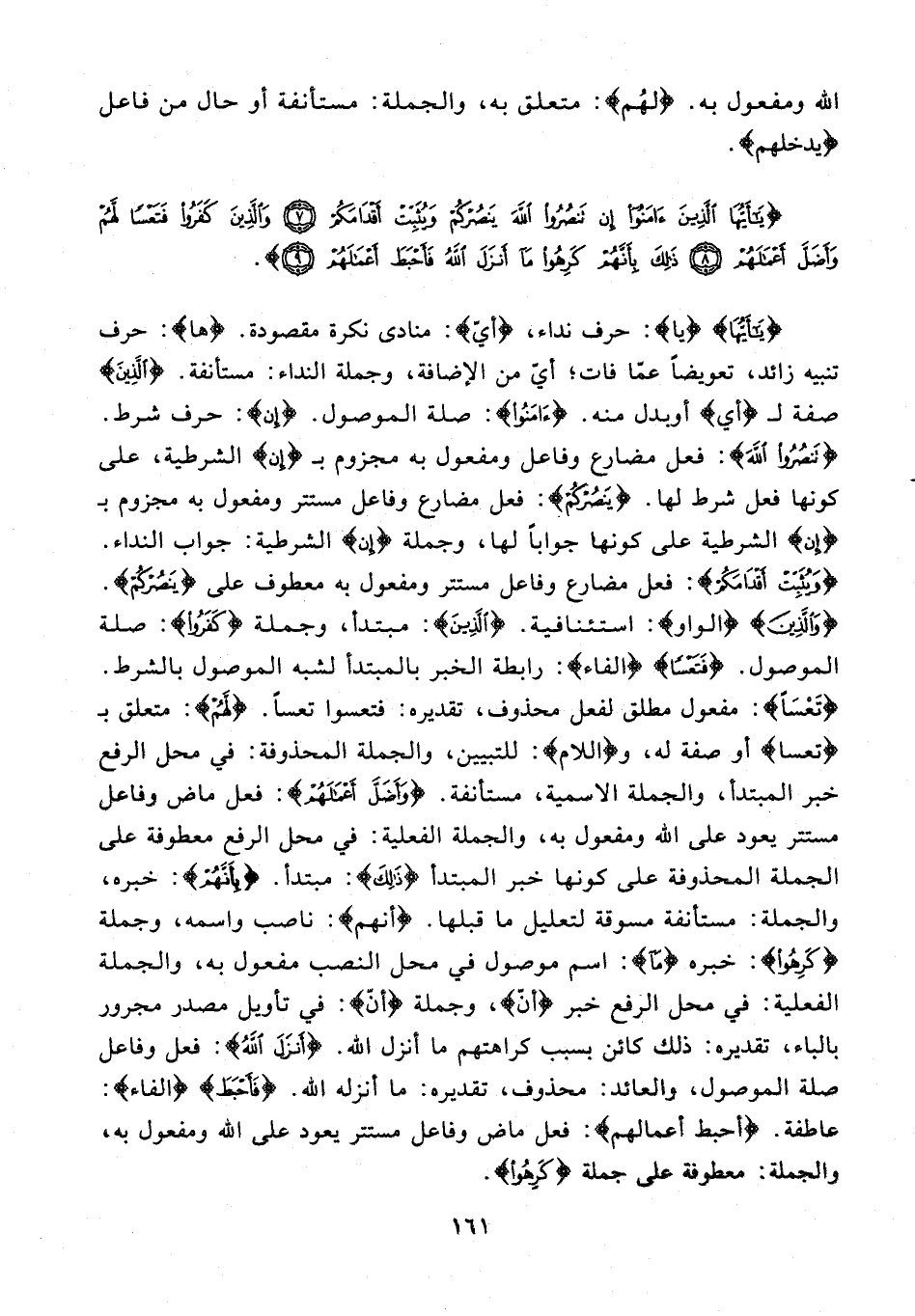 {يَا أَيُّهَا} {يَا}: حرف نداء، {أيّ}: منادى نكرة مقصودة. {ها}: حرف تنبيه زائد، تعويضًا عمّا فات؛ أيّ من الإضافة، وجملة النداء: مستأنفة. {الَّذِينَ} صفة لـ {أي} أو بدل منه. {آمَنُوا}: صلة الموصول. {إِن}: حرف شرط. {تَنْصُرُوا اللَّهَ}: فعل مضارع وفاعل ومفعول به مجزوم بـ {إِن} الشرطية، على كونها فعل شرط لها. {يَنْصُرْكُمْ}: فعل مضارع وفاعل مستتر ومفعول به مجزوم بـ {إِنْ} الشرطية على كونا جوابًا لها، وجملة {إن} الشرطية: جواب النداء. {وَيُثَبِّتْ أَقْدَامَكُمْ}: فعل مضارع وفاعل مستتر ومفعول به معطوف على {يَنْصُرْكُمْ}. {وَالَّذِينَ} {الواو}: استئنافية {الَّذِينَ}: مبتدأ، وجملة {كفروا}: صلة الموصول. {فَتَعْسًا} {الفاء}: رابطة الخبر بالمبتدأ لشبه الموصول بالشرط. {تَعْسًا}: مفعول مطلق لفعل محذوف، تقديره: فتعسوا تعسًا. {لَهُمْ}: متعلق بـ {تعسا} أو صفة له، و {اللام}: للتبيين، والجملة المحذوفة: في محل الرفع خبر المبتدأ، والجملة الاسمية، مستأنفة. {وَأَضَلَّ أَعْمَالَهُمْ}: فعل ماض فاعل مستتر يعود على الله ومفعول به، والجملة الفعلية: في محل الرفع معطوفة على الجملة المحذوفة على كونها خبر المبتدأ {ذَلَكَ}: مبتدأ. {بِأَنَّهُمْ}: خبره، والجملة: مستأنفة مسوقة لتعليل ما قبلها. {أَنَّهُمْ}: ناصب واسمه، وجملة {كَرِهُوا}: خبره {ماَ}: اسم وصول في محل النصب مفعول به، والجملة الفعلية: في محل الرفع خبر {أنّ}، وجملة أنّ: في تأويل مصدر مجرور بالباء، تقديره: ذلك كائن بسبب كراهتهم ما أنزل الله. {أَنْزَلَ اللَّهُ}: فعل وفاعل صلة الموصول، والعائد: محذوف، تقديره: ما أنزله الله. {فَأَحْبَطَ} {الفاء}: عاطفة. {أحبط أعمالهم}: فعل ماض وفاعل مستتر يعود على الله ومفعول به والجملة: معطوفة على جملة {كَرِهُوا}.
