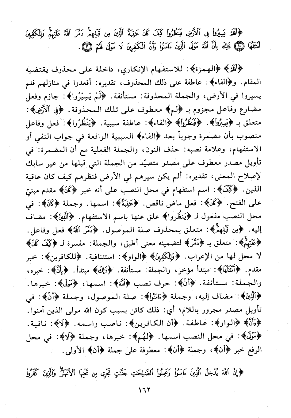 {أَفَلَمْ} {الهمزة}: للاستفهام الإنكاري، داخلة على محذوف يقتضيه المقام. و {الفاء}: عاطفة على ذلك المحذوف، تقديره: أقعدوا في منازلهم فلم يسيروا في الأرض، والجملة المحذوفة: مستأنفة. {لَمْ يَسِيرُوا}: جازم وفعل مضارع وفاعل مجزوم بـ {لم} معطوف على تلك المحذوفة. {فِي الْأَرْضِ}: متعلق بـ {يَسِيرُوا}. {فَيَنْظُرُوا} {الفاء}: عاطفة سببية. {يَنْظُرُوا}: فعل وفاعل منصوب بأن مضمرة وجوبًا بعد {الفاء} السببية الواقعة في جواب النفي أو الاستفهام، وعلامة نصبه: حذف النون، والجملة الفعلية مع أن المضمرة: في تأويل مصدر معطوف على مصدر متصيّد من الجملة التي قبلها من غير سابك لإصلاح المعنى، تقديره: ألم يكن سيرهم في الأرض فنظرهم كيف كان عاقبة الذين. {كَيْفَ}: اسم استفهام في محل النصب على أنه خبر {كاَنَ} مقدم مبنيّ على الفتح. {كاَنَ}: فعل ماض ناقص. {عَاقِبَةُ}: اسمها. وجملة {كاَنَ}: في محل النصب مفعول لـ {يَنظُروا} علق عنها باسم الاستفهام. {الَّذِينَ}: مضاف إليه. {مِنْ قَبْلِهِمْ}: متعلق بمحذوف صلة الموصول. {دَمَّرَ اللَّهُ} فعل وفاعل. {عَلَيْهِمْ}: متعلق بـ {دَمَّرَ} لتضمينه معنى أطبق، والجملة: مفسرة لـ {كَيْفَ كَانَ} لا محل لها من الإعراب. {وَلِلْكَافِرِينَ} {الواو}: استئنافية. {لِلْكَافِرِينَ}: خبر مقدم. {أَمْثَالُهَا}: مبتدأ مؤخر، والجملة: مستأنفة. {ذَلِكَ} مبتدأ. {بِأَنَّ}: خبره، والجملة: مستأنفة. {أنّ}: حرف نصب {اللَّهَ}: اسمها، {مَولَى}:خبرها. {الَّذِينَ}: مضاف إليه، وجملة {آمَنُوا}:صلة الموصول، وجملة {أنّ}: في تأويل مصدر مجرور باللام؛ أي: ذلك كائن بسبب كون الله مولى الذين آمنوا. {وَأَنَّ} {الواو}: عاطفة. {أن الكافرين}: ناصب واسمه. {لَا}: نافية. {مَولَى}: في محل النصب اسمها. {لَهُمْ}: خبرها، وجملة {لَا}: في محل الرفع خبر {أن}، وجملة {أن}: معطوفة على جملة {أن} الأولى.