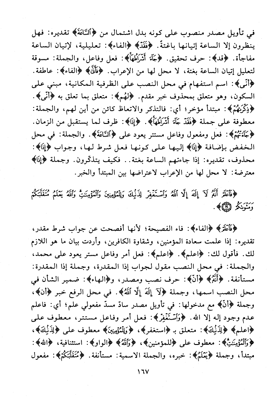 {فَاعْلَمْ} {الفاء}: فاء الفصيحة؛ لأنها أفصحت عن جواب شرط مقدر، تقديره: إذا علمت سعادة المؤمنين، وشقاوة الكافرين، وأردت بيان ما هو اللازم لك. فأقول لك: {اعلم}. {اعلم}: فعل أمر وفاعل مستر يعود على محمد، والجملة: في محل النصب مقول لجواب إذا المقدرة، وجملة إذا المقدرة: مستأنفة. {أَنَّهُ} {أن}: حرف نصب ومصدر، و {الهاء}: ضمير الشأن في محل النصب اسمها، وجملة {لَا إِلَهَ إِلَّا اللَّهُ}. في محل الرفع خبر {أن}، وجملة {أنّ} مع مدخولها: في تأويل مصدر سادّ مسدّ مفعولي علم؛ أي: فاعلم عدم وجود إله إلا الله. {اسْتَغْفِرْ}: فعل أمر وفاعل مستتر، معطوف على {اعلم} {لِذَنْبِكَ}: متعلق بـ {اسْتَغْفِر}، {وَلِلْمُؤْمِنِينَ} معطوف على {لِذَنْبِك}، {وَالْمُؤْمِنَاتِ}: معطوف على {لِلْمُؤْمِنِينَ}، {وَاللَّهُ} {الواو}: استئنافية، {الله}: مبتدأ، وجملة {يَعْلَمُ}: خبره، والجملة الاسمية: مستأنفة. {مُتَقَلَّبَكُمْ}: مفعول