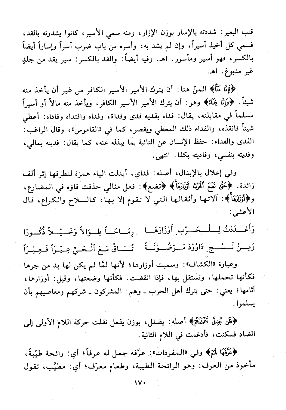 وفي إعلال بالإبدال، أصله: فداي، أبدلت الياء همزة لتطرفها إثر ألف زائدة. {حَتَّى تَضَعَ الْحَرْبُ أَوْزَارَهَا} {تَضَعَ}: فعل مثالي حذفت فاؤه في المضارع، و {أَوْزَارَهَا}: آلاتها وأثقالها التي لا تقوم إلا بها، كالسلاح والكراع، قال الأعشى: