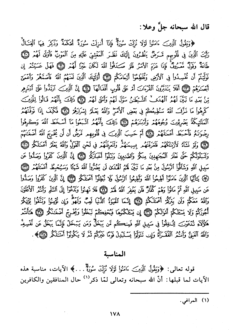 {وَيَقُولُ الَّذِينَ آمَنُوا لَوْلَا نُزِّلَتْ سُورَةٌ فَإِذَا أُنْزِلَتْ سُورَةٌ مُحْكَمَةٌ وَذُكِرَ فِيهَا الْقِتَالُ رَأَيْتَ الَّذِينَ فِي قُلُوبِهِمْ مَرَضٌ يَنْظُرُونَ إِلَيْكَ نَظَرَ الْمَغْشِيِّ عَلَيْهِ مِنَ الْمَوْتِ فَأَوْلَى لَهُمْ (20) طَاعَةٌ وَقَوْلٌ مَعْرُوفٌ فَإِذَا عَزَمَ الْأَمْرُ فَلَوْ صَدَقُوا اللَّهَ لَكَانَ خَيْرًا لَهُمْ (21) فَهَلْ عَسَيْتُمْ إِنْ تَوَلَّيْتُمْ أَنْ تُفْسِدُوا فِي الْأَرْضِ وَتُقَطِّعُوا أَرْحَامَكُمْ (22) أُولَئِكَ الَّذِينَ لَعَنَهُمُ اللَّهُ فَأَصَمَّهُمْ وَأَعْمَى أَبْصَارَهُمْ (23) أَفَلَا يَتَدَبَّرُونَ الْقُرْآنَ أَمْ عَلَى قُلُوبٍ أَقْفَالُهَا (24) إِنَّ الَّذِينَ ارْتَدُّوا عَلَى أَدْبَارِهِمْ مِنْ بَعْدِ مَا تَبَيَّنَ لَهُمُ الْهُدَى الشَّيْطَانُ سَوَّلَ لَهُمْ وَأَمْلَى لَهُمْ (25) ذَلِكَ بِأَنَّهُمْ قَالُوا لِلَّذِينَ كَرِهُوا مَا نَزَّلَ اللَّهُ سَنُطِيعُكُمْ فِي بَعْضِ الْأَمْرِ وَاللَّهُ يَعْلَمُ إِسْرَارَهُمْ (26) فَكَيْفَ إِذَا تَوَفَّتْهُمُ الْمَلَائِكَةُ يَضْرِبُونَ وُجُوهَهُمْ وَأَدْبَارَهُمْ (27) ذَلِكَ بِأَنَّهُمُ اتَّبَعُوا مَا أَسْخَطَ اللَّهَ وَكَرِهُوا رِضْوَانَهُ فَأَحْبَطَ أَعْمَالَهُمْ (28) أَمْ حَسِبَ الَّذِينَ فِي قُلُوبِهِمْ مَرَضٌ أَنْ لَنْ يُخْرِجَ اللَّهُ أَضْغَانَهُمْ (29) وَلَوْ نَشَاءُ لَأَرَيْنَاكَهُمْ فَلَعَرَفْتَهُمْ بِسِيمَاهُمْ وَلَتَعْرِفَنَّهُمْ فِي لَحْنِ الْقَوْلِ وَاللَّهُ يَعْلَمُ أَعْمَالَكُمْ (30) وَلَنَبْلُوَنَّكُمْ حَتَّى نَعْلَمَ الْمُجَاهِدِينَ مِنْكُمْ وَالصَّابِرِينَ وَنَبْلُوَ أَخْبَارَكُمْ (31) إِنَّ الَّذِينَ كَفَرُوا وَصَدُّوا عَنْ سَبِيلِ اللَّهِ وَشَاقُّوا الرَّسُولَ مِنْ بَعْدِ مَا تَبَيَّنَ لَهُمُ الْهُدَى لَنْ يَضُرُّوا اللَّهَ شَيْئًا وَسَيُحْبِطُ أَعْمَالَهُمْ (32) يَا أَيُّهَا الَّذِينَ آمَنُوا أَطِيعُوا اللَّهَ وَأَطِيعُوا الرَّسُولَ وَلَا تُبْطِلُوا أَعْمَالَكُمْ (33) إِنَّ الَّذِينَ كَفَرُوا وَصَدُّوا عَنْ سَبِيلِ اللَّهِ ثُمَّ مَاتُوا وَهُمْ كُفَّارٌ فَلَنْ يَغْفِرَ اللَّهُ لَهُمْ (34) فَلَا تَهِنُوا وَتَدْعُوا إِلَى السَّلْمِ وَأَنْتُمُ الْأَعْلَوْنَ وَاللَّهُ مَعَكُمْ وَلَنْ يَتِرَكُمْ أَعْمَالَكُمْ (35) إِنَّمَا الْحَيَاةُ الدُّنْيَا لَعِبٌ وَلَهْوٌ وَإِنْ تُؤْمِنُوا وَتَتَّقُوا يُؤْتِكُمْ أُجُورَكُمْ وَلَا يَسْأَلْكُمْ أَمْوَالَكُمْ (36) إِنْ يَسْأَلْكُمُوهَا فَيُحْفِكُمْ تَبْخَلُوا وَيُخْرِجْ أَضْغَانَكُمْ (37) هَا أَنْتُمْ هَؤُلَاءِ تُدْعَوْنَ لِتُنْفِقُوا فِي سَبِيلِ اللَّهِ فَمِنْكُمْ مَنْ يَبْخَلُ وَمَنْ يَبْخَلْ فَإِنَّمَا يَبْخَلُ عَنْ نَفْسِهِ وَاللَّهُ الْغَنِيُّ وَأَنْتُمُ الْفُقَرَاءُ وَإِنْ تَتَوَلَّوْا يَسْتَبْدِلْ قَوْمًا غَيْرَكُمْ ثُمَّ لَا يَكُونُوا أَمْثَالَكُمْ (38)}.