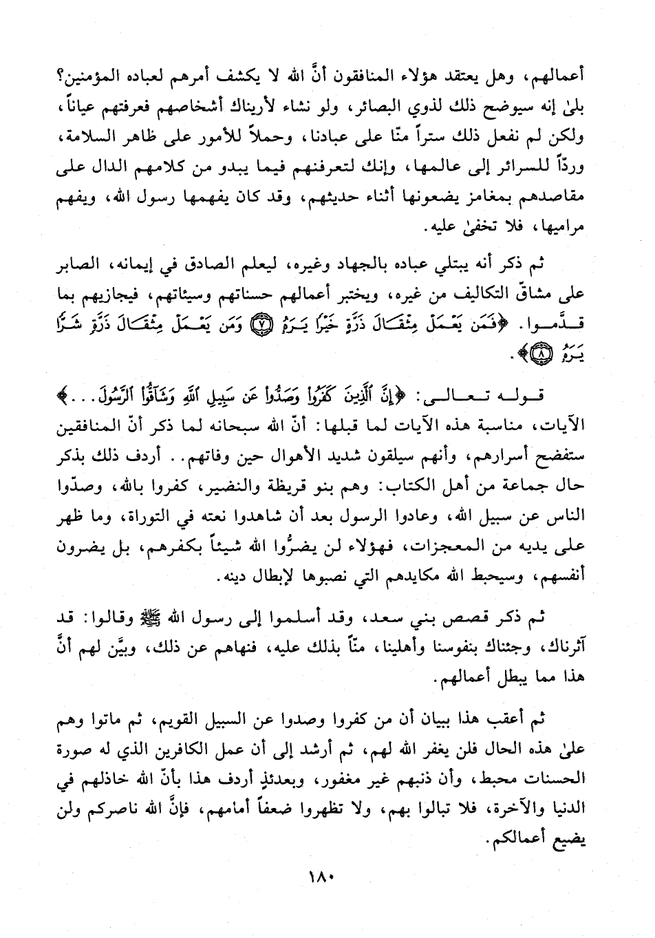 قوله تعالى: {إِنَّ الَّذِينَ كَفَرُوا وَصَدُّوا عَنْ سَبِيلِ اللَّهِ وَشَاقُّوا الرَّسُولَ ...} الآيات، مناسبة هذه الآيات لما قبلها: أن الله سبحانه لما ذكر أنّ المنافقين ستفضح أسرارهم، وأنهم سيلقون شديد الأهوال بين وفاتهم .. أردف ذلك بذكر حال جماعة من أهل الكتاب: وهم بنو قريظة والنضير، كفروا بالله، وصدّوا الناس عن سبيل الله، وعادوا الرسول بعد أن شاهدوا نعته في التوراة، وما ظهر على يديه من المعجزات، فهؤلاء لن يضرُّوا الله شيئًا بكفرهم، بل يضرون أنفسهم، وسيحبط الله مكايدهم التي نصبوها لإبطال دينه.