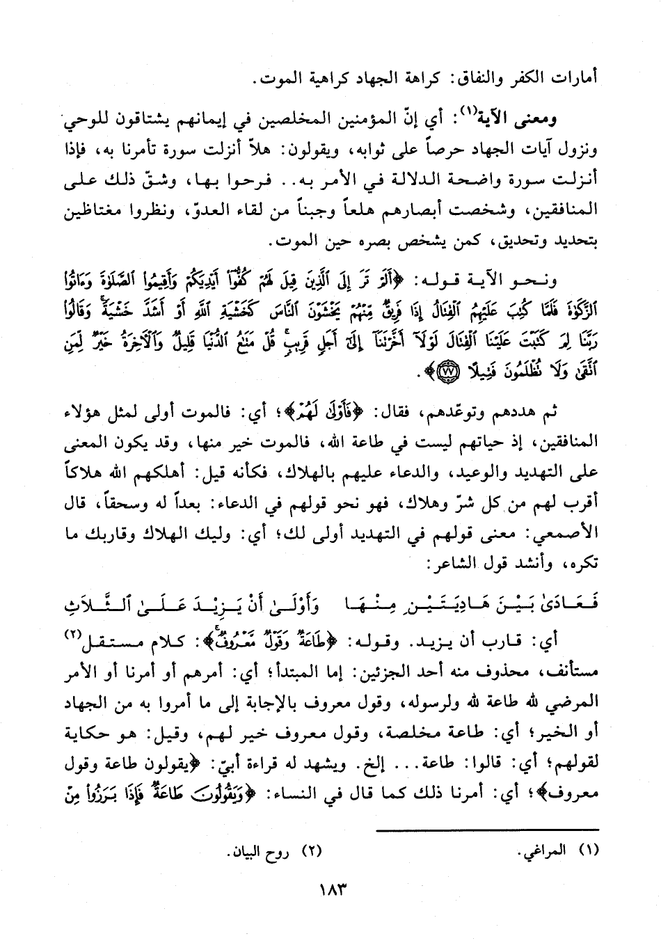 21 - وقوله: {طَاعَةٌ وَقول معْرُوف}: كلام مستقل (¬2) مستأنف، محذوف منه أحد الجزئين: إما المبتدأ؛ أي: أمرهم أو أمرنا أو الأمر المرضي لله طاعة لله ولرسوله، وقول معروف بالإجابة إلى ما أمروا به من الجهاد أو الخير؛ أي: طاعة مخلصة، وقول معروف خير لهم، وقيل: هو حكاية لقولهم؛ أي: قالوا: طاعة ... إلخ. ويشد له قراءة أبيّ: {يقولون طاعة وقول معروف}؛ أي: أمرنا ذلك كما قال في النساء: {وَيَقُولُونَ طَاعَةٌ فَإِذَا بَرَزُوا مِنْ