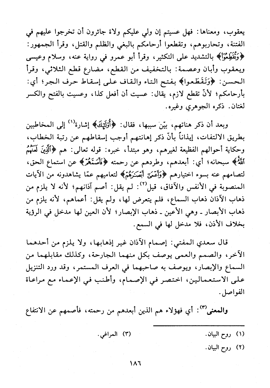 23 - وبعد أن ذكر هناتهم، بيّن سببها، فقال: {أُولَئِكَ} إشارة (¬1) إلى المخاطبين بطريق الالتفات، إيذانًا بأنّ ذكر إهانتهم أوجب إسقاطهم عن رتبة الخطاب، وحكاية أحوالهم الفظيعة لغيرهم، وهو مبتدأ، خبره: قوله تعالى: هم {الَّذِينَ لَعَنَهُمُ اللَّهُ} سبحانه؛ أي: أبعدهم، وطردهم عن رحمته {فَأَصَمَّهُمْ} عن استماع الحق، لتصامهم عنه بسوء اختيارهم {وَأَعْمَى أَبْصَارَهُمْ} لتعاميهم عمّا يشاهدونه من الآيات المنصوبة في الأنفس والآفاق، قيل (¬2): لم يقل: أصم آذانهم؛ لأنه لا يلزم من ذهاب الآذان ذهاب السماع، فلم يتعرض لها، ولم يقل: أعماهم؛ لأنه يلزم من ذهاب الأبصار - وهي الأعين - ذهاب الإبصار؛ لأن العين لها مدخل في الرؤية بخلاف الأذن، فلا مدخل لها في السمع.