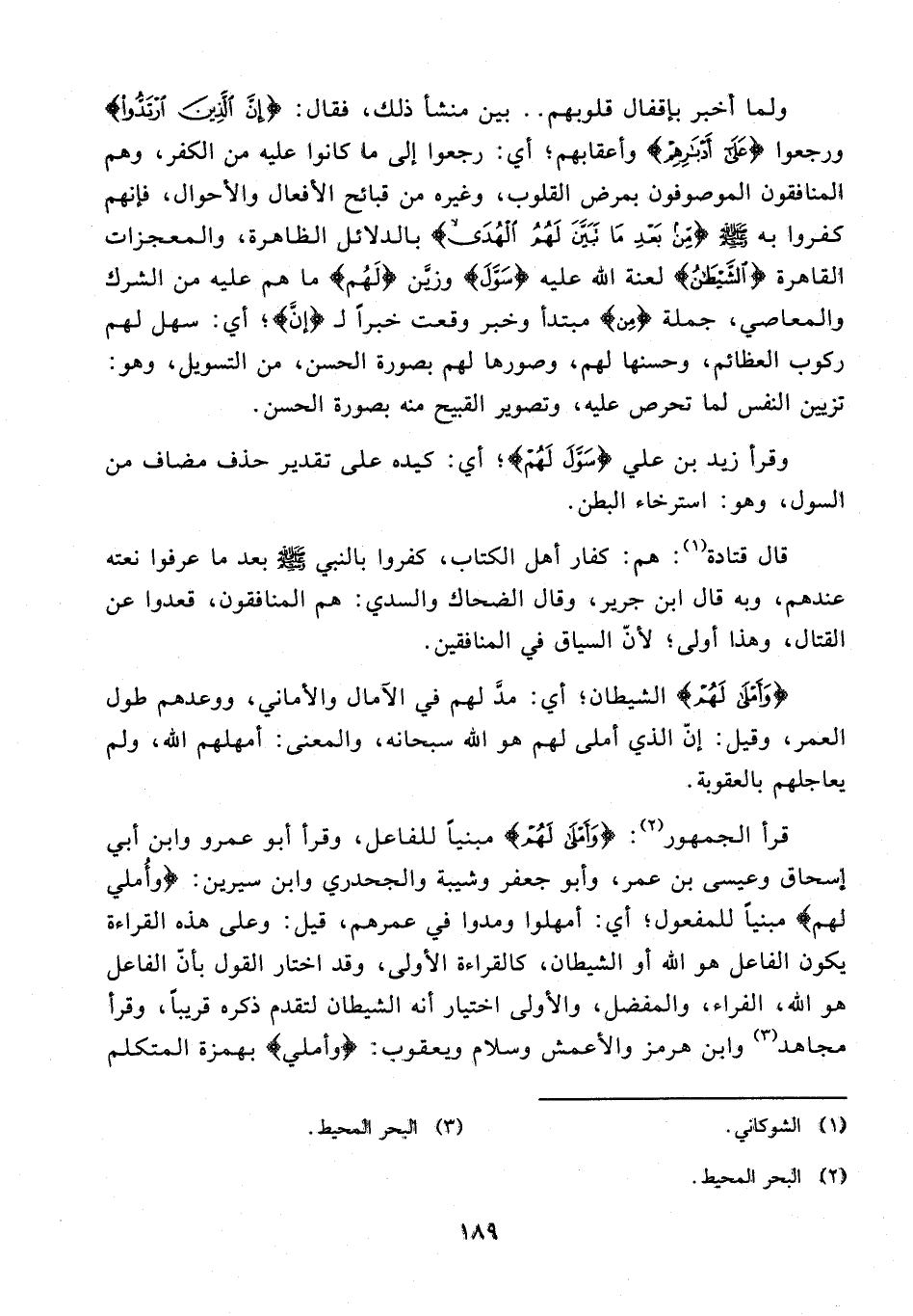 25 - ولما أخبر بإقفال قلوبهم .. بين منشأ ذلك، فقال: {إِنَّ الَّذِينَ ارْتَدُّوا} ورجعوا {عَلَى أَدْبَارِهِمْ} وأعقابهم؛ أي: رجعوا إلى ما كانوا عليه من الكفر، وهم المنافقون الموصوفون بمرض القلوب، وغيره من قبائح الأفعال والأحوال، فإنهم كفروا به - صلى الله عليه وسلم - {مِنْ بَعْدِ مَا تَبَيَّنَ لَهُمُ الْهُدَى} بالدلائل الظاهرة، والمعجزات القاهرة {الشَّيْطَانُ} لعنة الله عليه {سَوَّلَ} وزيَّن {لَهُمْ} ما هم عليه أو الشرك والمعاصي، جملة {مِن} مبتدأ وخبر وقعت خبرًا لـ {إِنَّ}؛ أي: سهل لهم ركوب العظائم، وحسنها لهم، وصورها لهم بصورة الحسن، من التسويل، وهو: تزيين النفس لما تحرص عليه، وتصوير القبيح منه بصورة الحسن.