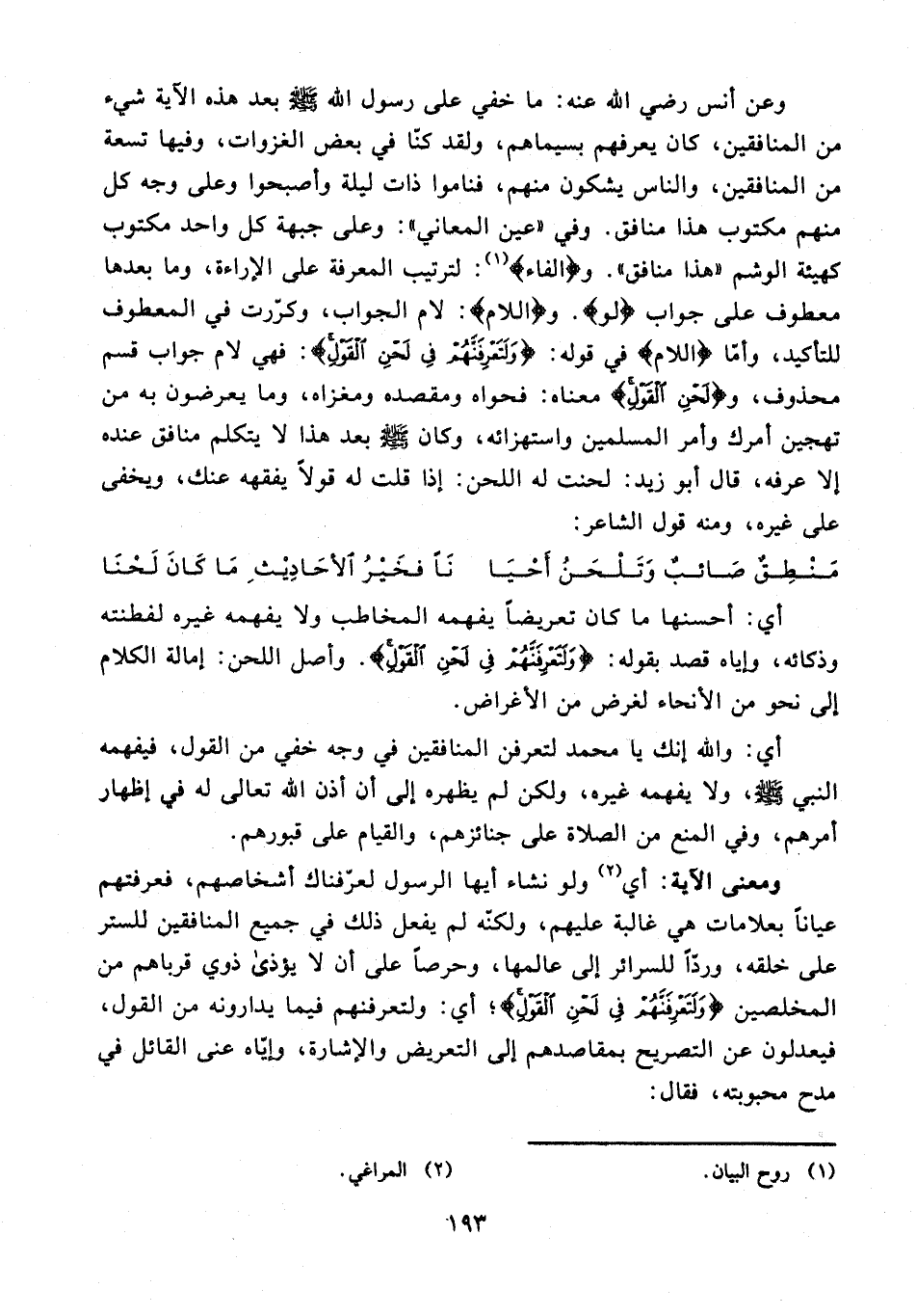 ومعنى الآية: أي (¬2) ولو نشاء أيها الرسول لعرّفناك أشخاصهم، فعرفتهم عيانًا بعلامات هي غالبة عليهم، ولكنّه لم يفعل ذلك في جميع المنافقين للستر على خلقه، وردًا للسرائر إلى عالمها، وحرصًا على أن لا يؤذى ذوي قرباهم من المخلصين {وَلَتَعْرِفَنَّهُمْ فِي لَحْنِ الْقَوْلِ}؛ أي: ولتعرفنهم فيما يدارونه من القول، فيعدلون عن التصريح بمقاصدهم إلى التعريض والإشارة، وإياه عنى القائل في مدح محبوبته، فقال: