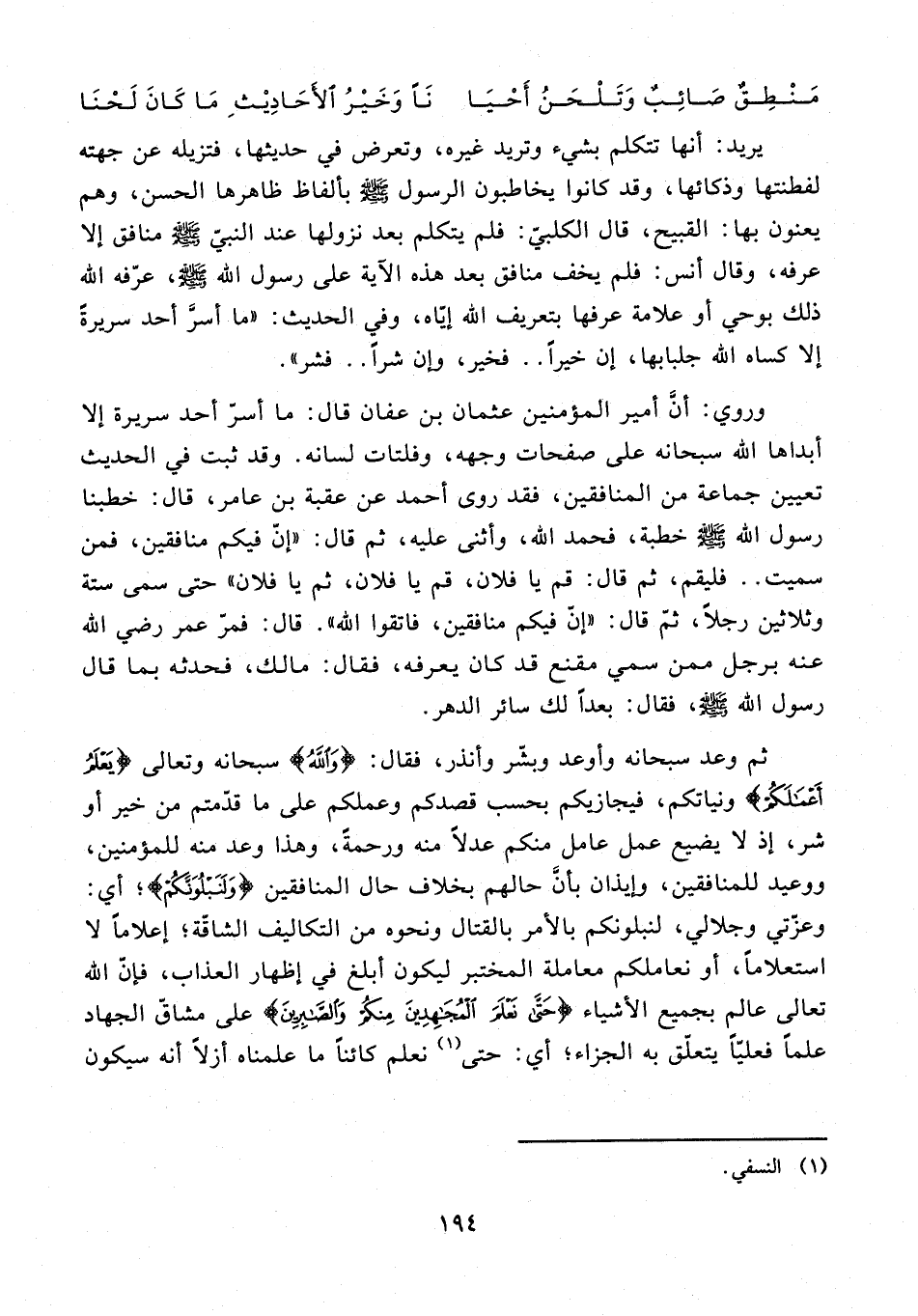 وروي: أنَّ أمير المؤمنين عثمان بن عفان قال: ما أسرّ أحد سريرة إلا أبداها الله سبحانه على صفحات وجهه، وفلتات لسانه. وقد ثبت في الحديث تعيين جماعة من المنافقين، فقد روى أحمد عن عقبة بن عامر، قال: خطبنا رسول الله - صلى الله عليه وسلم - خطبة، فحمد الله، وأثنى عليه، ثم قال: "إنّ فيكم منافقين، فمن سميت .. فليقم، ثم قال: قم يا فلان، قم يا فلان، ثم يا فلان" حتى سمى ستة وثلاثين رجلًا، ثمّ قال: "إنّ فيكم منافقين، فاتقوا الله". قال: فمرّ عمر رضي الله عنه برجل ممن سمي مقنع قد كان يعرفه، فقال: مالك، فحدثه بما قال رسول الله - صلى الله عليه وسلم -، فقال: بعدًا لك سائر الدهر.