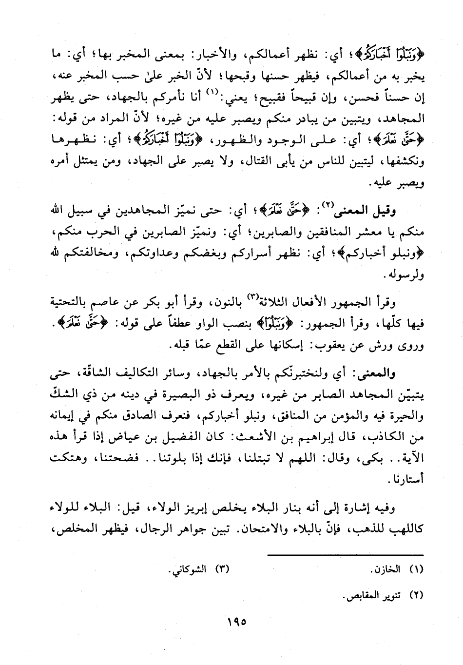 وقرأ الجمهور الأفعال الثلاثة (¬3) بالنون، وقرأ أبي بكر عن عاصم بالتحتية فيها كلّها، وقرأ الجمهور: {وَنَبْلُوَ}، بنصب الواو عطفًا على قوله: {حَتَّى نَعْلَمَ}. وروى ورش عن يعقوب: إسكانها على القطع عمّا قبله.