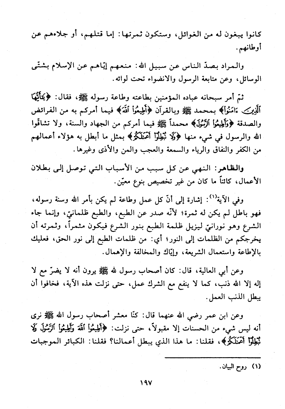 33 - ثمّ أمر سبحانه عباده المؤمنين بطاعته وطاعة رسوله - صلى الله عليه وسلم -، فقال: {يَاأَيُّهَا الَّذِينَ آمَنُوا} بمحمد وبالقرآن {أَطِيعُوا اللَّهَ} فيما أمركم به من الفرائض والصدقة {وَأَطِيعُوا الرَّسُولَ} محمدًا - صلى الله عليه وسلم - فيما أمركم أو الجهاد والسنة، ولا تشاقّوا الله والوسول في شيء منها {وَلَا تُبْطِلُوا أَعْمَالَكُمْ} بمثل ما أبطل به هؤلاء أعمالهم من الكفر والنفاق والرياء والسمعة والعجب والمن والأذى وغيرها.