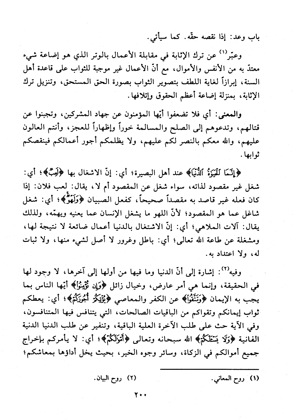 36 - {إِنَّمَا الْحَيَاةُ الدُّنْيَا} عند أهل البصيرة؛ أي: إن الإشغال بها {لَعِبٌ}؛ أي: شغل غير مقصود لذاته، سواء شغل عن المقصود أم لا، يقال: لعب فلان: إذا كان فعله غير قاصد به مقصدًا صحيحًا، كفعل الصبيان {وَلَهْوٌ}؛ أي: شغل شاغل عما هو المقصود؛ لأن اللهو ما يشغل الإنسان عما يعنيه ويهمّه، ولذلك يقال: آلات الملاهي؛ أي: إنّ الاشتغال بالدنيا أعمال ضائعة لا نتيجة لها، ومشغلة عن طاعة الله تعالى؛ أي: باطل وغرور لا أصل لشيء منها، ولا ثبات له، ولا اعتداد به.
