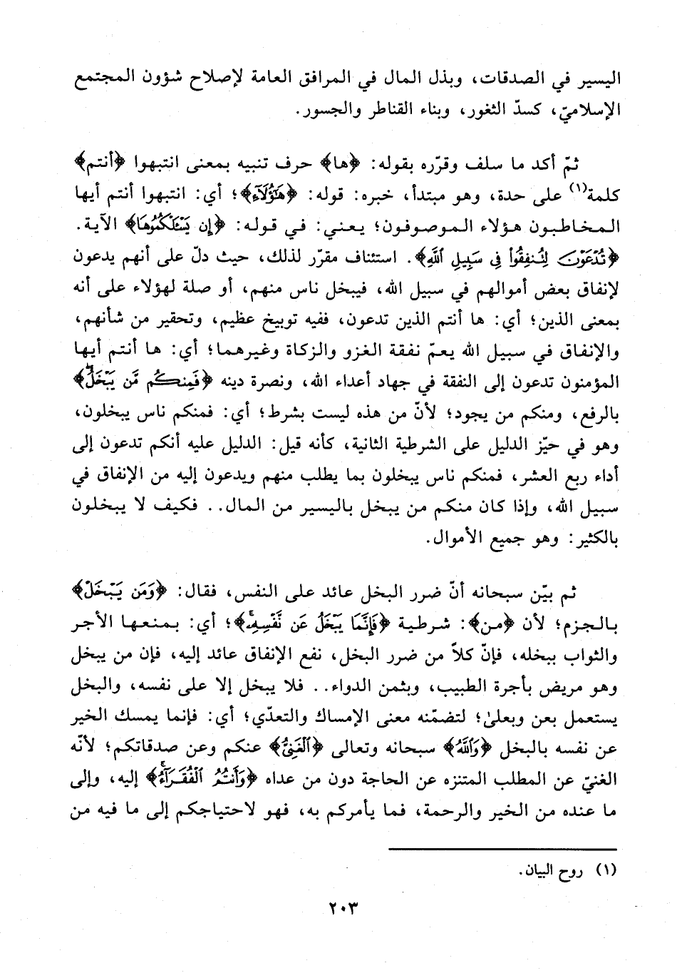 38 - ثمّ أكد ما سلف وقرّره بقوله: {هَا} حرف تنبيه بمعنى انتبهوا {أَنْتُمْ} كلمة (¬1) على حدة، وهو مبتدأ، خبره: قوله: {هَؤُلَاءِ}؛ أي: انتبهوا أنتم أيها المخاطبون هؤلاء الموصوفون؛ يعني: في قوله: {إِنْ يَسْأَلْكُمُوهَا} الآية. {تُدْعَوْنَ لِتُنْفِقُوا فِي سَبِيلِ اللَّهِ}. استئناف مقرّر لذلك، حيث دلّ على أنهم يدعون لإنفاق بعض أموالهم في سبيل الله، فيبخل ناس منهم، أو صلة لهؤلاء على أنه بمعنى الذين؛ أي: ها أنتم الذين تدعون، ففيه توبيخ عظيم، وتحقير من شأنهم، والإنفاق في سبيل الله يعمّ نفقة الغزو والزكاة وغيرهما؛ أي: ها أنتم أيها المؤمنون تدعون إلى النفقة في جهاد أعداء الله، ونصرة دينه {فَمِنْكُمْ مَنْ يَبْخَلُ} بالرفع، ومنكم من يجود؛ لأنّ من هذه ليست بشرط؛ أي: فمنكم ناس يبخلون، وهو في حيّز الدليل على الشرطية الثانية، كأنه قيل: الدليل عليه أنكم تدعون إلى أداء ربع العشر، فمنكم ناس يبخلون بما يطلب منهم ويدعون إليه من الإنفاق في سبيل الله، وإذا كان منكم من يبخل باليسير من المال .. فكيف لا يبخلون بالكثير: وهو جميع الأموال.