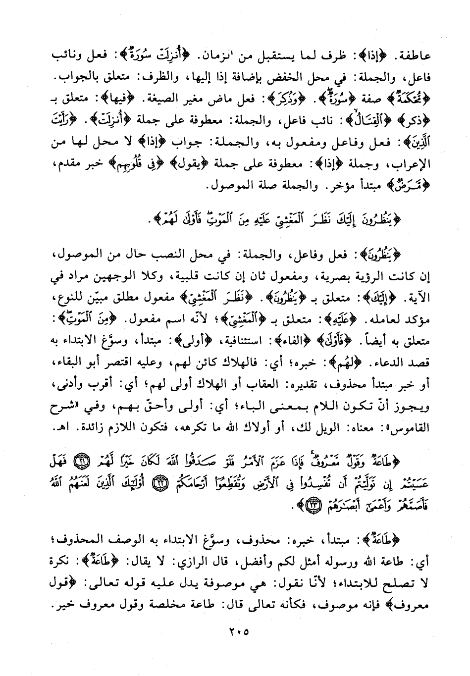 عاطفة. {إذا}: ظرف لما يستقبل من الزمان. {أُنْزِلَتْ سُورَةٌ}: فعل ونائب فاعل، والجملة: في محل الخفض بإضافة إذا إليها، والظرف: متعلق بالجواب. {محكمة} صفة {سورة}. {وذكر}: فعل ماض مغير الصيغة. {فيها}: متعلق بـ {ذكر} {القتال}: نائب فاعل، والجملة: معطوفة على جملة {أُنزِلَتْ}. {رأيت الذين}: فعل وفاعل ومفعول به، والجملة: جواب {إذا} لا محل لها من الإعراب، وجملة {إذا}: معطوفة على جملة {يقول} {في قلوبهم} خبر مقدم، {مرض} مبتدأ مؤخر. والجملة صلة الموصول.