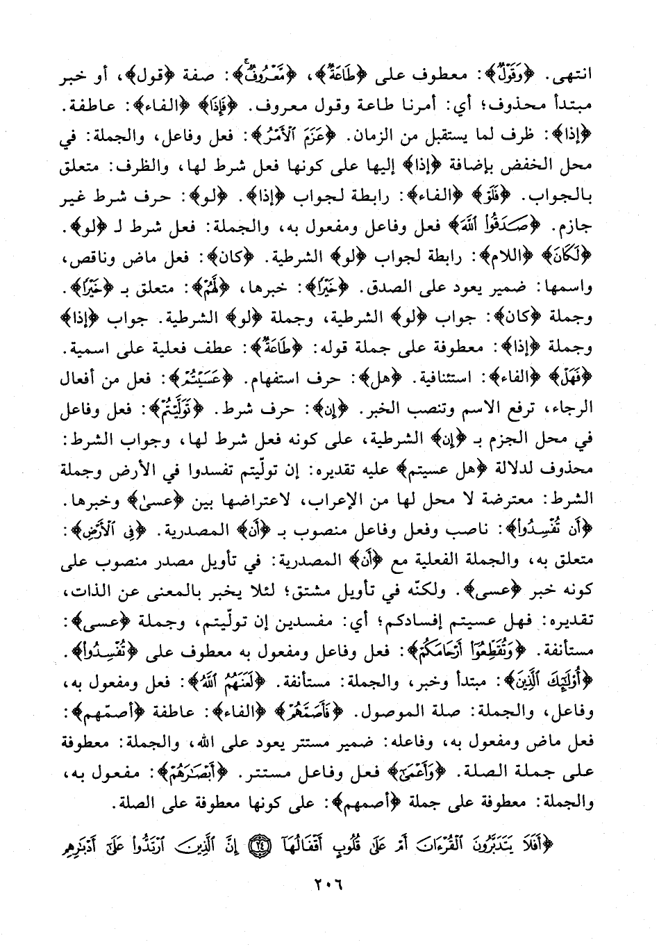 انتهى. {وقول}: معطوف على {طاعة}، {معروف}: صفة {قول}، أو خبر مبتدأ محذوف؛ أي: أمرنا طاعة وقول معروف. {فإذا} {الفاء}: عاطفة. {إذا}: ظرف لما يستقبل من الزمان. {عزم الأمر}: فعل وفاعل، والجملة: في محل الخفض بإضافة {إذا} إليها على كونها فعل شرط لها، والظرف: متعلق بالجواب. {فَلَوْ} {الفاء}: رابطة لجواب {إذا}. {لو}: حرف شرط غير جازم. {صدقوا الله} فعل وفاعل ومفعول به، والجملة: فعل شرط لـ {لو}. {لكان} {اللام}: رابطة لجواب {لو} الشرطية. {كان}: فعل ماض وناقص، واسمها: ضمير يعود على الصدق. {خَيْرًا}: خبرها، {لهم}: متعلق بـ {خيرًا}. وجملة {كان}: جواب {لو} الشرطية، وجملة {لو} الشرطية. جواب {إذا} وجملة {إذا}: معطوفة على جملة قوله: {طَاعَةٌ}: عطف فعلية على اسمية. {فَهَلْ} {الفاء}: استئنافية. {هل}: حرف استفهام. {عَسَيْتُمْ}: فعل أو أفعال الرجاء، ترفع الاسم وتنصب الخبر. {إن}: حرف شرط. {تَوَلَّيْتُمْ}: فعل وفاعل في محل الجزم بـ {إن} الشرطية، على كونه فعل شرط لها، وجواب الشرط: محذوف لدلالة {هل عسيتم} عليه تقديره: إن تولّيتم تفسدوا في الأرض وجملة الشرط: معترضة لا محل لها من الإعراب، لاعتراضها بين {عسى} وخبرها. {أن تفسدوا}: ناصب يفعل وفاعل منصوب بـ {أَن} المصدرية. {في الأرض}: متعلق به، والجملة الفعلية مع {أَن} المصدرية: في تأويل مصدر منصوب على كونه خبر {عسى}. ولكنّه في تأويل مشتق؛ لئلا يخبر بالمعنى عن الذات، تقديره: فهل عسيتم إفسادكم؛ أي: مفسدين من تولّيتم، وجملة {عسى}: مستأنفة. {وَتُقَطِّعُوا أَرْحَامَكُمْ}: فعل وفاعل ومفعول به معطوف على {تفسدوا}. {أُولَئِكَ الَّذِينَ}: مبتدأ وخبر، والجملة: مستأنفة. {لعنهم الله}: فعل ومفعول به، وفاعل، والجملة: صلة الموصول. {فأصمهم} {الفاء}: عاطفة {أصمّهم}: فعل ماض ومفعول به، وفاعله: ضمير مستتر يعود على الله، والجملة: معطوفة على جملة الصلة. {وأعمى} فعل وفاعل مستتر. {أَبصارهم}: مفعول به، والجملة: معطوفة على جملة {أصمهم}: على كونها معطوفة على الصلة.