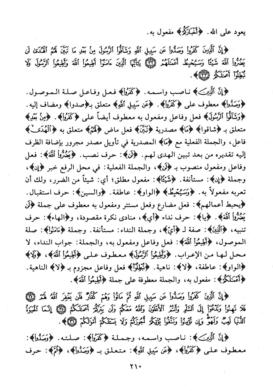 {إن الذين} ناصب واسمه. {كفروا} فعل وفاعل صلة الموصول. {وصدوا} معطوف على {كفروا}. {عن سبيل الله} متعلق بـ {صدوا} ومضاف إليه. {وشاقوا الرسول} فعل وفاعل ومفعول به معطوف أيضًا على {كفروا}. {من بعد} متعلق بـ {شاقوا} {مَا} مصدرية {تبين} فعل ماض {لهم} متعلق به {الهدى} فاعل، والجملة الفعلية مع {مَا} المصدرية في تأويل مصدر مجرور بإضافة الظرف إليه تقديره من بعد تبين الهدى لهم. {لَن}: حرف نصب. {يضروا الله}: فعل وفاعل ومفعول منصوب بـ {لن}، والجملة الفعلية: في محل الرفع خبر {إن}، وجملة {إن}: مستأنفة. {شيئًا}: مفعول مطلق؛ أي: شيئًا من الضرر، ولك أن تعربه مفعولًا به. {وسيحبط} {الواو}: عاطفة. {والسين}: حرف استقبال. {يحبط أعمالهم}: فعل مضارع وفعل مستتر ومفعول به معطوف على جملة {لَن يضروا الله}. {يا}: حرف نداء {أي}، منادى نكرة مقصودة، و {الهاء}: حرف تنبيه، {الذين}: صفة لـ {أيّ}، وجملة النداء: مستأنفة. وجملة {آمَنُوا}: صلة الموصول، {أطيعوا الله}: فعل وفاعل ومفعول به، والجملة: جواب النداء، لا محل لها من الإعراب. {وأطِيعُوا اَلرسُولَ} معطوف على {أَطِيعُوا اللهَ}، {وَلَا} {الواو}: عاطفة، {لا}: ناهية. {تبطلوا} فعل وفاعل مجزوم بـ {لا} الناهية. {أعمالكم}: مفعول به، والجملة معطوفة على جملة {أَطيعوا الله}.