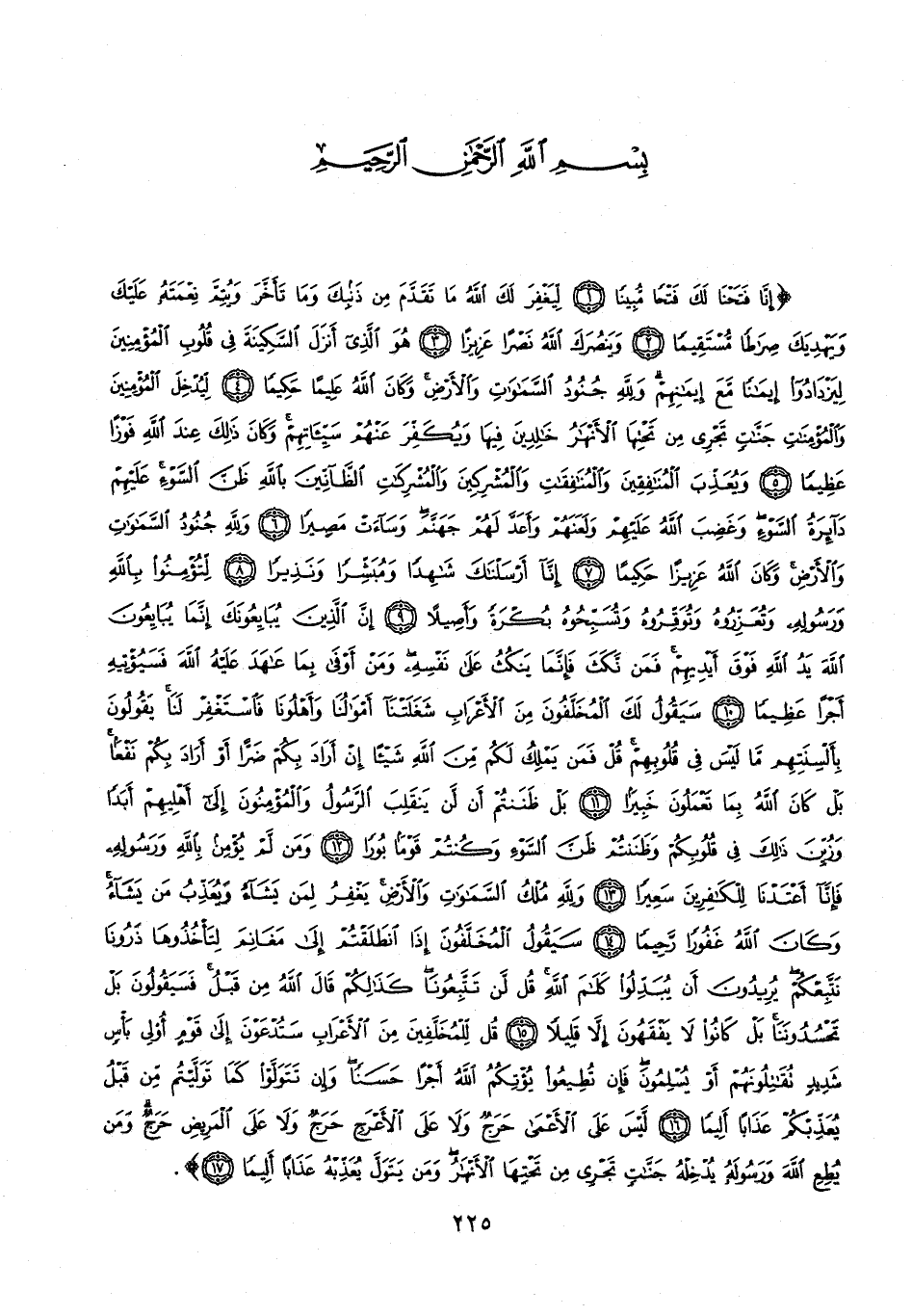 {إِنَّا فَتَحْنَا لَكَ فَتْحًا مُبِينًا (1) لِيَغْفِرَ لَكَ اللَّهُ مَا تَقَدَّمَ مِنْ ذَنْبِكَ وَمَا تَأَخَّرَ وَيُتِمَّ نِعْمَتَهُ عَلَيْكَ وَيَهْدِيَكَ صِرَاطًا مُسْتَقِيمًا (2) وَيَنْصُرَكَ اللَّهُ نَصْرًا عَزِيزًا (3) هُوَ الَّذِي أَنْزَلَ السَّكِينَةَ فِي قُلُوبِ الْمُؤْمِنِينَ لِيَزْدَادُوا إِيمَانًا مَعَ إِيمَانِهِمْ وَلِلَّهِ جُنُودُ السَّمَاوَاتِ وَالْأَرْضِ وَكَانَ اللَّهُ عَلِيمًا حَكِيمًا (4) لِيُدْخِلَ الْمُؤْمِنِينَ وَالْمُؤْمِنَاتِ جَنَّاتٍ تَجْرِي مِنْ تَحْتِهَا الْأَنْهَارُ خَالِدِينَ فِيهَا وَيُكَفِّرَ عَنْهُمْ سَيِّئَاتِهِمْ وَكَانَ ذَلِكَ عِنْدَ اللَّهِ فَوْزًا عَظِيمًا (5) وَيُعَذِّبَ الْمُنَافِقِينَ وَالْمُنَافِقَاتِ وَالْمُشْرِكِينَ وَالْمُشْرِكَاتِ الظَّانِّينَ بِاللَّهِ ظَنَّ السَّوْءِ عَلَيْهِمْ دَائِرَةُ السَّوْءِ وَغَضِبَ اللَّهُ عَلَيْهِمْ وَلَعَنَهُمْ وَأَعَدَّ لَهُمْ جَهَنَّمَ وَسَاءَتْ مَصِيرًا (6) وَلِلَّهِ جُنُودُ السَّمَاوَاتِ وَالْأَرْضِ وَكَانَ اللَّهُ عَزِيزًا حَكِيمًا (7) إِنَّا أَرْسَلْنَاكَ شَاهِدًا وَمُبَشِّرًا وَنَذِيرًا (8) لِتُؤْمِنُوا بِاللَّهِ وَرَسُولِهِ وَتُعَزِّرُوهُ وَتُوَقِّرُوهُ وَتُسَبِّحُوهُ بُكْرَةً وَأَصِيلًا (9) إِنَّ الَّذِينَ يُبَايِعُونَكَ إِنَّمَا يُبَايِعُونَ اللَّهَ يَدُ اللَّهِ فَوْقَ أَيْدِيهِمْ فَمَنْ نَكَثَ فَإِنَّمَا يَنْكُثُ عَلَى نَفْسِهِ وَمَنْ أَوْفَى بِمَا عَاهَدَ عَلَيْهُ اللَّهَ فَسَيُؤْتِيهِ أَجْرًا عَظِيمًا (10) سَيَقُولُ لَكَ الْمُخَلَّفُونَ مِنَ الْأَعْرَابِ شَغَلَتْنَا أَمْوَالُنَا وَأَهْلُونَا فَاسْتَغْفِرْ لَنَا يَقُولُونَ بِأَلْسِنَتِهِمْ مَا لَيْسَ فِي قُلُوبِهِمْ قُلْ فَمَنْ يَمْلِكُ لَكُمْ مِنَ اللَّهِ شَيْئًا إِنْ أَرَادَ بِكُمْ ضَرًّا أَوْ أَرَادَ بِكُمْ نَفْعًا بَلْ كَانَ اللَّهُ بِمَا تَعْمَلُونَ خَبِيرًا (11) بَلْ ظَنَنْتُمْ أَنْ لَنْ يَنْقَلِبَ الرَّسُولُ وَالْمُؤْمِنُونَ إِلَى أَهْلِيهِمْ أَبَدًا وَزُيِّنَ ذَلِكَ فِي قُلُوبِكُمْ وَظَنَنْتُمْ ظَنَّ السَّوْءِ وَكُنْتُمْ قَوْمًا بُورًا (12) وَمَنْ لَمْ يُؤْمِنْ بِاللَّهِ وَرَسُولِهِ فَإِنَّا أَعْتَدْنَا لِلْكَافِرِينَ سَعِيرًا (13) وَلِلَّهِ مُلْكُ السَّمَاوَاتِ وَالْأَرْضِ يَغْفِرُ لِمَنْ يَشَاءُ وَيُعَذِّبُ مَنْ يَشَاءُ وَكَانَ اللَّهُ غَفُورًا رَحِيمًا (14) سَيَقُولُ الْمُخَلَّفُونَ إِذَا انْطَلَقْتُمْ إِلَى مَغَانِمَ لِتَأْخُذُوهَا ذَرُونَا نَتَّبِعْكُمْ يُرِيدُونَ أَنْ يُبَدِّلُوا كَلَامَ اللَّهِ قُلْ لَنْ تَتَّبِعُونَا كَذَلِكُمْ قَالَ اللَّهُ مِنْ قَبْلُ فَسَيَقُولُونَ بَلْ تَحْسُدُونَنَا بَلْ كَانُوا لَا يَفْقَهُونَ إِلَّا قَلِيلًا (15) قُلْ لِلْمُخَلَّفِينَ مِنَ الْأَعْرَابِ سَتُدْعَوْنَ إِلَى قَوْمٍ أُولِي بَأْسٍ شَدِيدٍ تُقَاتِلُونَهُمْ أَوْ يُسْلِمُونَ فَإِنْ تُطِيعُوا يُؤْتِكُمُ اللَّهُ أَجْرًا حَسَنًا وَإِنْ تَتَوَلَّوْا كَمَا تَوَلَّيْتُمْ مِنْ قَبْلُ يُعَذِّبْكُمْ عَذَابًا أَلِيمًا (16) لَيْسَ عَلَى الْأَعْمَى حَرَجٌ وَلَا عَلَى الْأَعْرَجِ حَرَجٌ وَلَا عَلَى الْمَرِيضِ حَرَجٌ وَمَنْ يُطِعِ اللَّهَ وَرَسُولَهُ يُدْخِلْهُ جَنَّاتٍ تَجْرِي مِنْ تَحْتِهَا الْأَنْهَارُ وَمَنْ يَتَوَلَّ يُعَذِّبْهُ عَذَابًا أَلِيمًا (17)}.