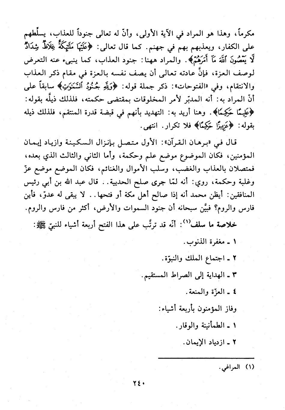 قال في "برهان القرآن": الأول متصل بإنزال السكينة وازياد إيمان المؤمنين، فكان الموضوع موضع علم وحكمة، وأما الثاني والثالث الذي بعده، فمتصلان بالعذاب والغضب، وسلب الأموال والغنائم، فكان الموضع موضع عزّ وغلبة وحكمة، روي: أنه لمّا جرى صلح الحديية .. قال عبد الله بن أبي رئيس المنافقين: أيظن محمد أنه إذا صالح أهل مكة أو فتحها .. لا يبقى له عدوّ، فأين فارس والروم؟ فبيَّن سبحانه أن جنود السموات والأرض، أكثر من فارس والروم.