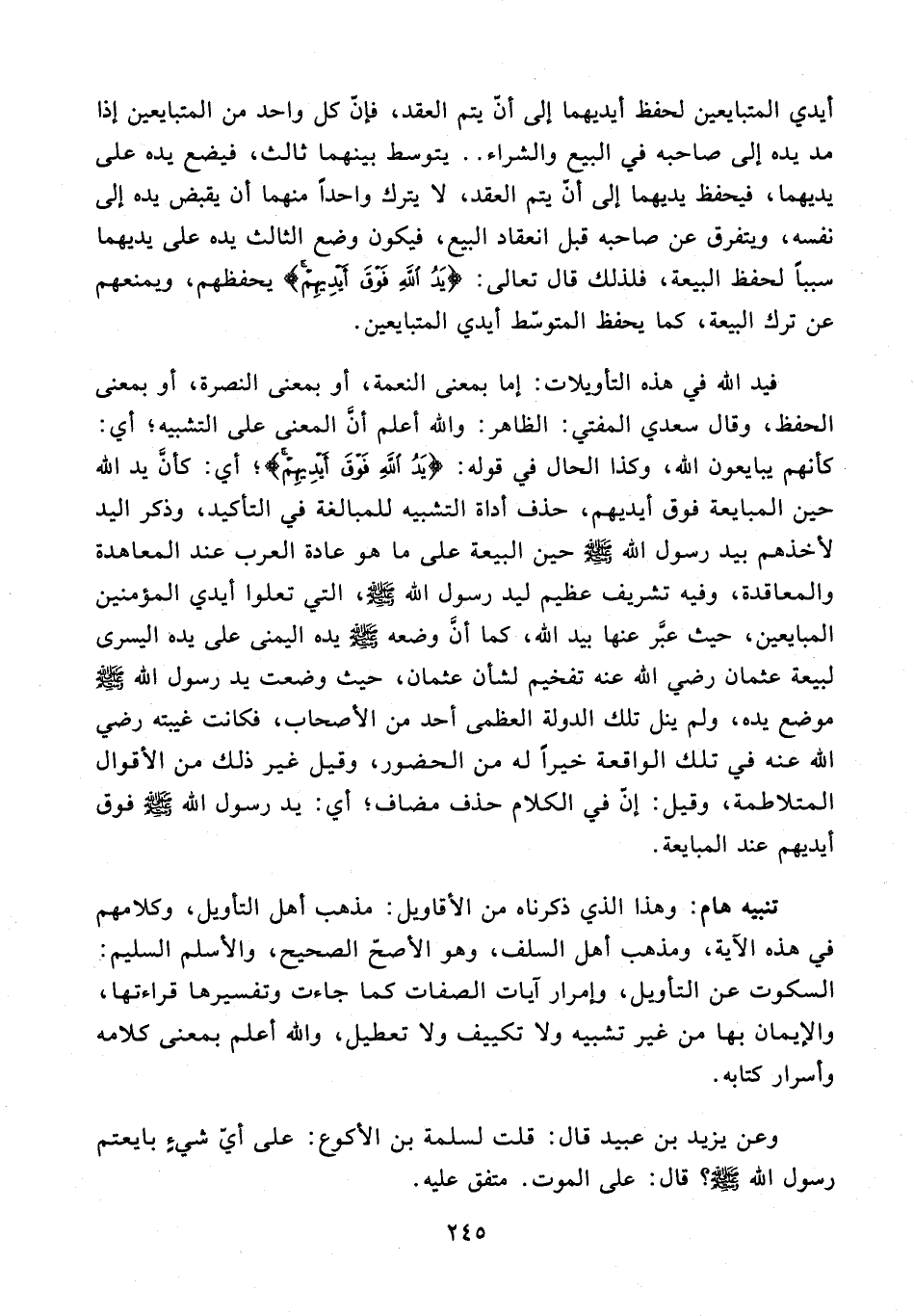 فيد الله في هذه التأويلات: إما بمعنى النعمة، أو بمعنى النصرة، أو بمعنى الحفظ، وقال سعدي المفتي: الظاهر: والله أعلم أنَّ المعنى على التشبيه؛ أي: كأنهم يبايعون الله، وكذا الحال في قوله: {يَدُ اللهِ فَوْقَ أَيْدِيهِمْ}؛ أي: كأنَّ يد الله حين المبايعة فوق أيديهم، حذف أداة التشبيه للمبالغة في التأكيد، وذكر اليد لأخذهم بيد رسول الله - صلى الله عليه وسلم - حين البيعة على ما هو عادة العرب عند المعاهدة والمعاقدة، وفيه تشريف عظيم ليد رسول الله - صلى الله عليه وسلم -، التي تعلوا أيدي المؤمنين المبايعين، حيث عبّر عنها بيد الله، كما أنَّ وضعه - صلى الله عليه وسلم - يده اليمنى على يده اليسرى لبيعة عثمان رضي الله عنه تفخيم لشأن عثمان، حيث وضعت يد رسول الله - صلى الله عليه وسلم - موضع يده، ولم ينل تلك الدولة العظمى أحد من الأصحاب، فكانت غيبته رضي الله عنه في تلك الواقعة خيرًا له من الحضور، وقيل غير ذلك من الأقوال المتلاطمة، وقيل: إنّ في الكلام حذف مضاف؛ أي: يد رسول الله - صلى الله عليه وسلم - فوق أيديهم عند المبايعة.