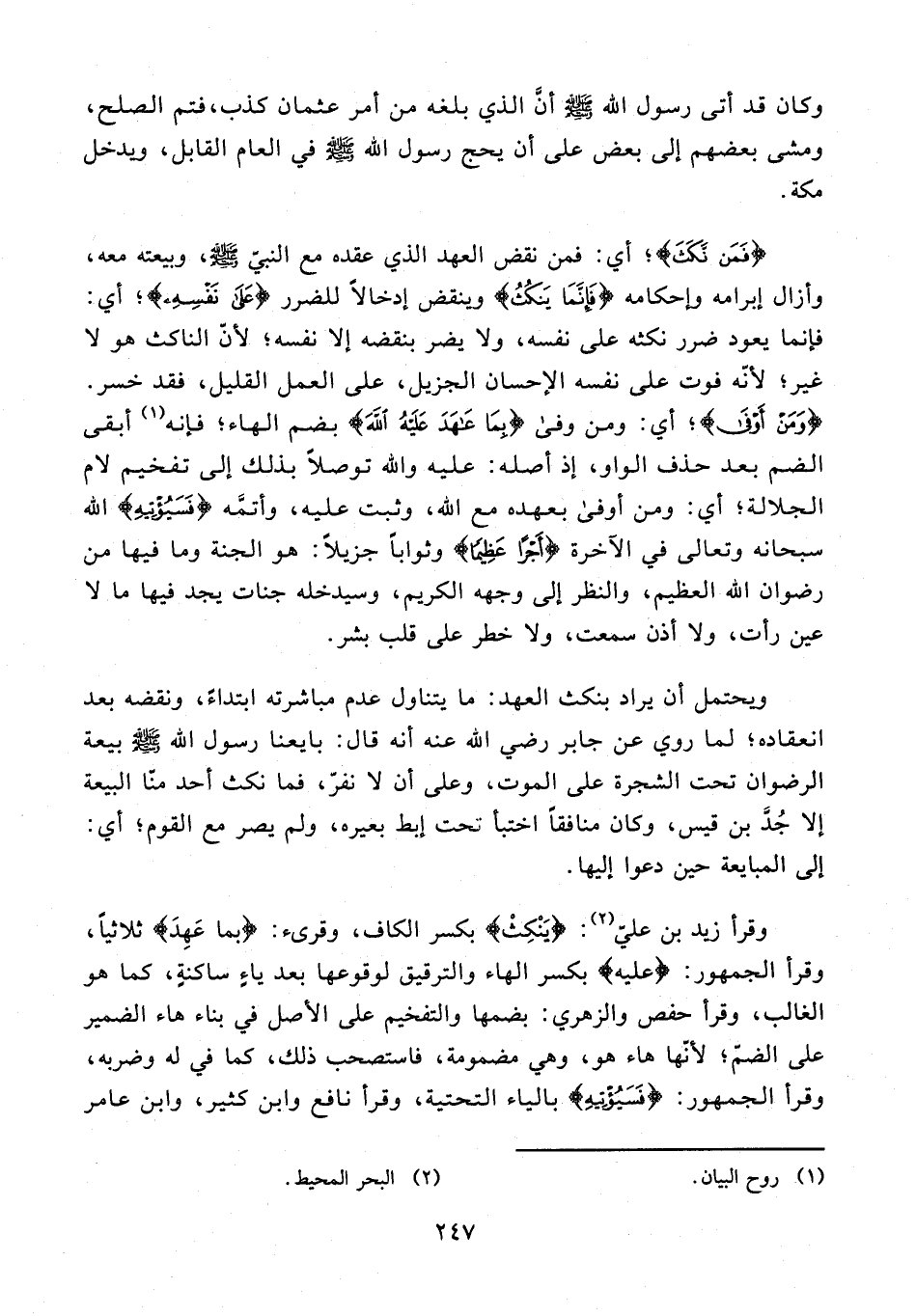 وقرأ زبد بن عليّ (¬2): {يَنْكِثْ} بكسر الكاف، وقرىء: {بما عَهِدَ} ثلاثيًا، وقرأ الجمهور: {عليه} بكسر الهاء والترقيق لوقوعها بعد ياءٍ ساكنةٍ، كما هو الغالب، وقرأ حفص والزهري: بضمها والتفخيم على الأصل في بناء هاء الضمير على الضمّ؛ لأنّها هاء هو، وهي مضمومة، فاستصحب ذلك، كما في له وضربه، وقرأ الجمهور: {فَسَيُؤْتِيهِ} بالياء التحتية، وقرأ نافع وابن كثير، وابن عامر