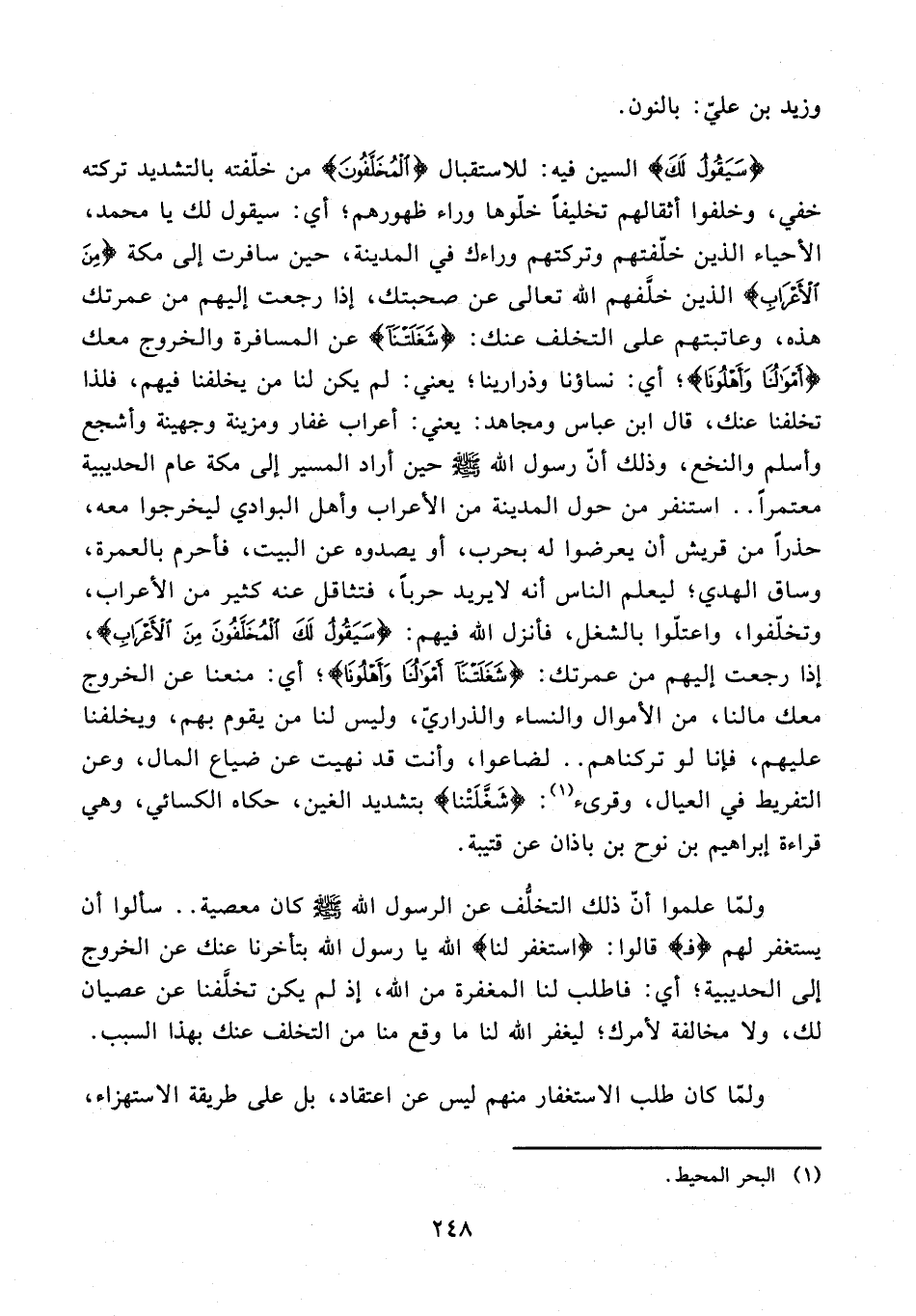 11 - {سَيَقُولُ لَكَ} السين فيه: للاستقبال {الْمُخَلَّفُونَ} من خلّفته بالتشديد تركته خفي، وخلفوا أثقالهم تخليفًا خلّوها وراء ظهورهم؛ أي: سيقول لك يا محمد، الأحياء الذين خلّفتهم وتركتهم وراءك في المدينة، حين سافرت إلى مكة {مِنَ الْأَعْرَابِ} الذين خلَّفهم الله تعالى عن صحبتك، إذا رجعت إليهم من عمرتك هذه، وعاتبتهم على التخلف عنك: {شَغَلَتْنَا} عن المسافرة والخروج معك {أَمْوَالُنَا وَأَهْلُونَا}؛ أي: نساؤنا وذرارينا؛ يعني: لم يكن لنا من يخلفنا فيهم، فلذا تخلفنا عنك، قال ابن عباس ومجاهد: يعني: أعراب غفار ومزينة وجهينة وأشجع وأسلم والنخع، وذلك أنّ رسول الله - صلى الله عليه وسلم - حين أراد المسير إلى مكة عام الحديبية معتمرًا .. استنفر من حول المدينة من الأعراب وأهل البوادي ليخرجوا معه، حذرًا من قريش أن يعرضوا له بحرب، أو يصدوه عن البيت، فأحرم بالعمرة، وساق الهدي؛ ليعلم الناس أنه لا يريد حربًا، فتثاقل عنه كثير من الأعراب، وتخلّفوا، واعتلّوا بالشغل، فأنزل الله فيهم: {سَيَقُولُ لَكَ الْمُخَلَّفُونَ مِنَ الْأَعْرَابِ}، إذا رجعت إليهم من عمرتك: {شَغَلَتْنَا أَمْوَالُنَا وَأَهْلُونَا}؛ أي: منعنا عن الخروج معك مالنا، من الأموال والنساء والذراريّ، وليس لنا من يقوم بهم، ويخلفنا عليهم، فإنا لو تركناهم .. لضاعوا، وأنت قد نهيت عن ضياع المال، وعن التفريط في العيال، وقرىء (¬1): {شَغَلَتْنَا} بتشديد الغين، حكاه الكسائي، وهي قراءة إبراهيم بن نوح بن باذان عن قتيبة.