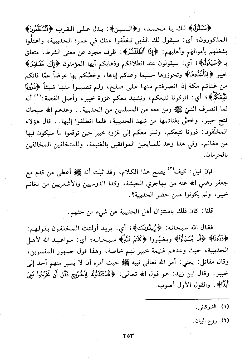 فقال الله سبحانه: {يُرِيدُونَ}؛ أي: يريد أولئك المخلفون بقولهم: {ذَرُونَا} {أَنْ يُبَدِّلُوا} ويغيِّروا {كَلَامَ اللهِ} سبحانه؛ أي: مواعيد الله لأهل الحديبية، حيث وعدهم غنيمة خيبر لهم خاصة، وهذا قول جمهور المفىسرين، وقال مقاتل: يعني: أمر الله تعالى نبيه - صلى الله عليه وسلم - حيث أمره أن لا يسير منهم أحد إلى خيبر. وقال ابن زيد: هو قول الله تعالى: {فَاسْتَأْذَنُوكَ لِلْخُرُوجِ فَقُلْ لَنْ تَخْرُجُوا مَعِيَ أَبَدًا}. والقول الأول أصوب.
