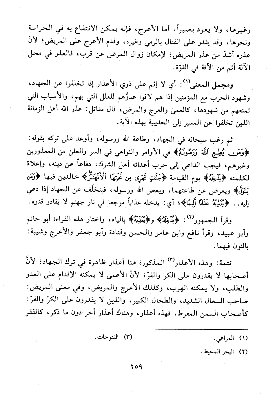 تتمة: وهذه الأعذار (¬3) المذكورة هنا أعذار ظاهرة في ترك الجهاد؛ لأنَّ أصحابها لا يقدرون على الكر والفرّ؛ لأنّ الأعمى لا يمكنه الإقدام على العدو والطلب، ولا يمكنه الهرب، وكذلك الأعرج والمريض، وفي معنى المريض: صاحب السعال الشديد، والطحال الكبير، والذين لا يقدرون على الكرّ والفرّ: كأصحاب السمن المفرط، فهذه أعذار، وهناك أعذار أخر دون ما ذكر، كالفقر
