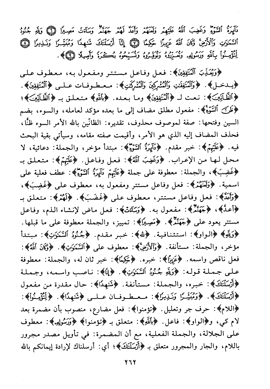 دَائِرَةُ السَّوْءِ وَغَضِبَ اللَّهُ عَلَيْهِمْ وَلَعَنَهُمْ وَأَعَدَّ لَهُمْ جَهَنَّمَ وَسَاءَتْ مَصِيرًا (6) وَلِلَّهِ جُنُودُ السَّمَاوَاتِ وَالْأَرْضِ وَكَانَ اللَّهُ عَزِيزًا حَكِيمًا (7) إِنَّا أَرْسَلْنَاكَ شَاهِدًا وَمُبَشِّرًا وَنَذِيرًا (8) لِتُؤْمِنُوا بِاللَّهِ وَرَسُولِهِ وَتُعَزِّرُوهُ وَتُوَقِّرُوهُ وَتُسَبِّحُوهُ بُكْرَةً وَأَصِيلًا (9)}.