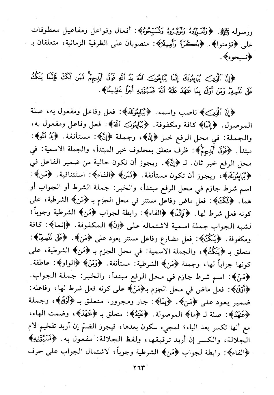 {إِنَّ الَّذِينَ} ناصب واسمه. {يُبَايِعُونَكَ}: فعل وفاعل ومفعول به، صلة الموصول. {إِنَّمَا} كافة ومكفوفة. {يُبَايِعُونَ اللَّهَ}: فعل وفاعل ومفعول به، والجملة: في محل الرفع خبر {إنّ}، وجملة {إنّ}: مستأنفة. {يَدُ اللَّهِ}: مبتدأ. {فَوْقَ أَيْدِيهِمْ}: ظرف متعلق بمحذوف خبر المبتدأ، والجملة الاسمية: في محل الرفع خبر ثان لـ {إِنَّ}. ويجوز أن تكون حالية من ضمير الفاعل في {يُبَايِعُونَكَ}، ويجوز أن تكون مستأنفة. {فَمَنْ} {الفاء}: استئنافية. {مَنْ}: اسم شرط جازم في محل الرفع مبتدأ، والخبر: جملة الشرط أو الجواب أو هما. {نَكَثَ}: فعل ماض وفاعل مستتر في محل الجزم بـ {مَنْ} الشرطية، على كونه فعل شرط لها. {فَإِنَّمَا} {الفاء}: رابطة لجواب {مَنْ} الشرطية وجوبًا؛ لشبه الجواب جملة اسمية لاشتماله على {إِنَّ} المكفوفة. {إِنَّمَا}: كافة ومكفوفة. {يَنْكُثُ}: فعل مضارع وفاعل مستتر يعود على {مَنْ}. {عَلَى نَفْسِهِ}: متعلق بـ {يَنْكُثُ}، والجملة الاسمية: في محل الجزم بـ {مَنْ} الشرطية، على كونها جوابًا لها، وجملة {مَنْ} الشرطية: مستأنفة. {وَمَنْ} {الواو}: عاطفة. {مَنْ}: اسم شرط جازم في على الرفع مبتدأ، والخبر: جملة الجواب. {أَوْفَى}: فعل ماض في محل الجزم بـ {مَنْ} على كونه فعل شرط لها، وفاعله: ضمير يعود على {مَنْ}. {بِمَا}: جار ومجرور، متعلق بـ {أَوْفَى}، وجملة {عَاهَدَ}: صلة لـ {مَا} الموصولة. {عَلَيْهُ}: متعلق بـ {عَاهَدَ}، وضمت الهاء، مع أنها تكسر بعد الياء؛ لمجيء سكون بعدها، فيجوز الضمّ إن أريد تفخيم لام الجلالة، والكسر إن أريد ترقيقها, ولفظ الجلالة: مفعول به. {فَسَيُؤْتِيهِ} {الفاء}: رابطة لجواب {مَنْ} الشرطية وجوبًا؛ لاشتمال الجواب على حرف