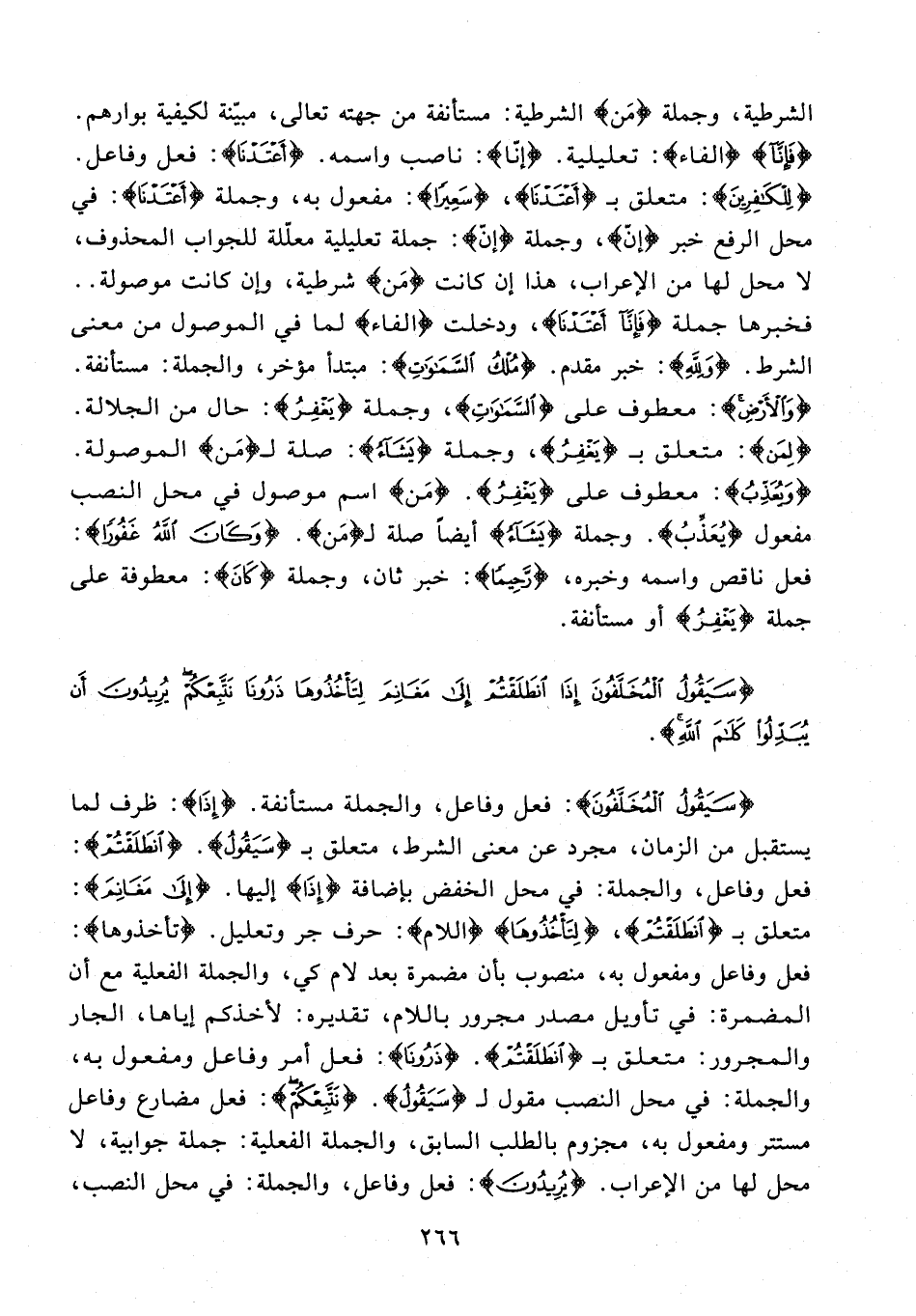 {سَيَقُولُ الْمُخَلَّفُونَ}: فعل وفاعل، والجملة مستأنفة. {إِذَا}: ظرف لما يستقبل من الزمان، مجرد عن معنى الشرط، متعلق بـ {سَيَقُولُ}. {انْطَلَقْتُمْ}: فعل وفاعل، والجملة: في محل الخفض بإضافة {إِذَا} إليها. {إِلَى مَغَانِمَ}: متعلق بـ {انْطَلَقْتُمْ}، {لِتَأْخُذُوهَا} {اللام}: حرف جر وتعليل. {تَأْخُذُوهَا}: فعل وفاعل ومفعول به، منصوب بأن مضمرة بعد لام كي، والجملة الفعلية مع أن المضمرة: في تأويل مصدر مجرور باللام، تقديره: لأخذكم إياها، الجار والمجرور: متعلق بـ {انْطَلَقْتُمْ}. {ذَرُونَا}: فعل أمر وفاعل ومفعول به، والجملة: في محل النصب مقول لـ {سَيَقُولُ}. {نَتَّبِعْكُمْ}: فعل مضارع وفاعل مستتر ومفعول به، مجزوم بالطلب السابق، والجملة الفعلية: جملة جوابية، لا محل لها من الإعراب. {يُرِيدُونَ}: فعل وفاعل، والجملة: في محل النصب،