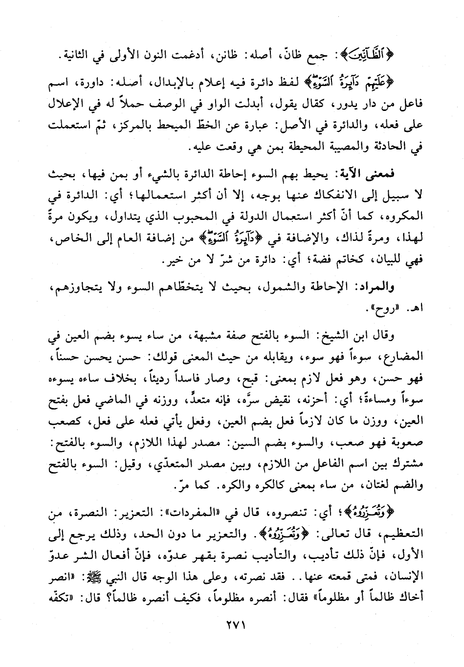 {عَلَيْهِمْ دَائِرَةُ السَّوْءِ} لفظ دائرة فيه إعلام بالإبدال، أصله: داورة، اسم فاعل من دار يدور، كقال يقول، أبدلت الواو في الوصف حملًا له في الإعلال على فعله، والدائرة في الأصل: عبارة عن الخطّ الميحط بالمركز، ثمّ استعملت في الحادثة والمصيبة المحيطة بمن هي وقعت عليه.
