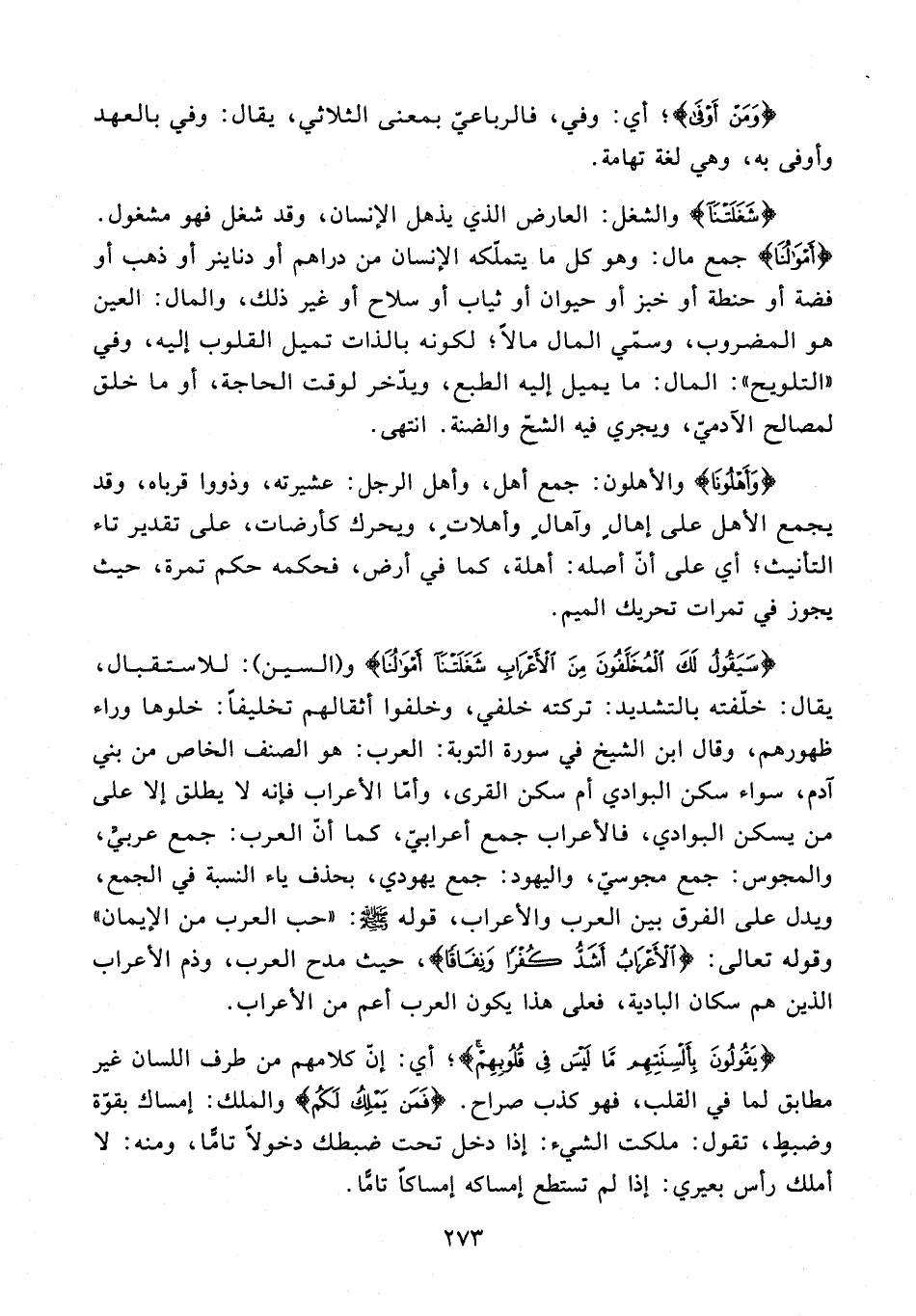 {سَيَقُولُ لَكَ الْمُخَلَّفُونَ مِنَ الْأَعْرَابِ شَغَلَتْنَا أَمْوَالُنَا} و (السين): للاستقبال، يقال: خلّفته بالتشديد: تركته خلفي، وخلفوا أثقالهم تخليفًا: خلوها وراء ظهورهم، وقال ابن الشيخ في سورة التوبة؛ العرب: هو الصنف الخاص من بني آدم، سواء سكن البوادي أم سكن القرى، وأمّا الأعراب فإنه لا يطلق إلا على من يسكن البوادي، فالأعراب جمع أعرابيّ, كما أن العرب: جمع عربيّ، والمجوس: جمع مجوسيّ، واليهود: جمع يهودي، بحذف ياء النسبة في الجمع، ويدل على الفرق بين العرب والأعراب، قوله - صلى الله عليه وسلم -: "حب العرب من الإيمان" وقوله تعالى: {الْأَعْرَابُ أَشَدُّ كُفْرًا وَنِفَاقًا}، حيث مدح العرب، وذم الأعراب الذين هم سكان البادية، فعلى هذا يكون العرب أعم من الأعراب.