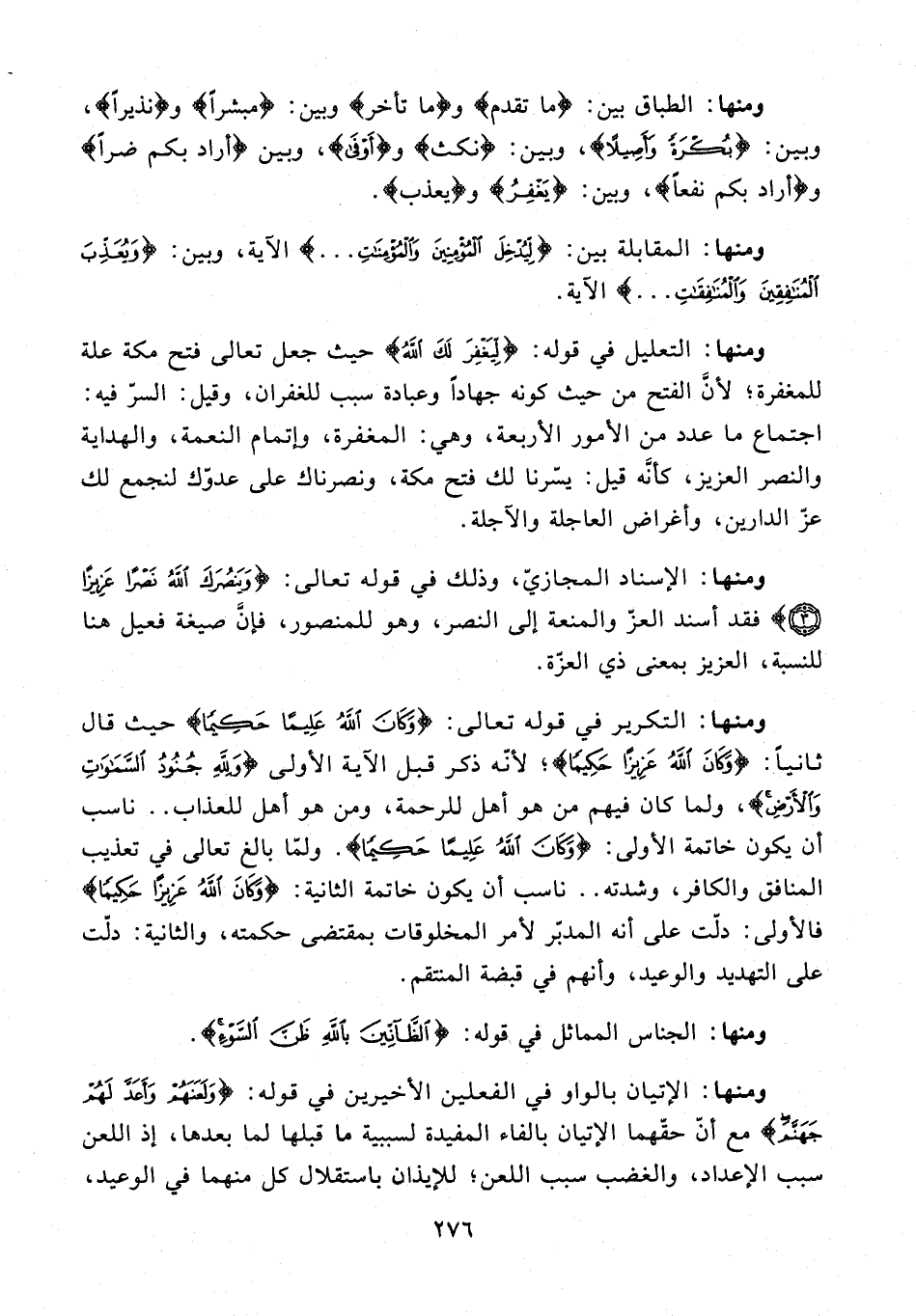 ومنها: الطباق بين: {مَا تَقَدَّمَ} و {مَا تَأَخَّرَ} وبين: {مُبَشِّرًا} و {نَذِيرًا}، وبين: {بُكْرَةً وَأَصِيلًا}، وبين: {نَكَثَ} و {أَوْفَى}، وبين {أَرَادَ بِكُمْ ضَرًّا} و {أَرَادَ بِكُمْ نَفْعًا}، وبين: {يَغْفِرُ} و {يُعَذِّبُ}.