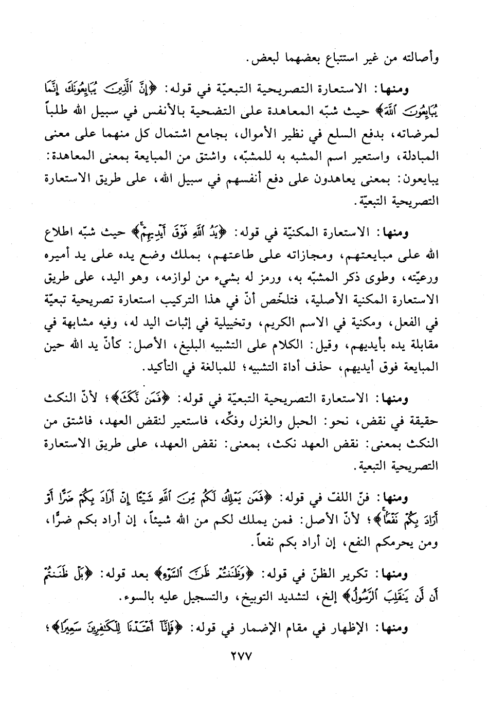 ومنها: الاستعارة التصريحية التبعيّة في قوله: {فَمَنْ نَكَثَ}؛ لأنّ النكث حقيقة في نقض، نحو: الحبل والغزل وفكِّه، فاستعير لنقض العهد، فاشتق من النكث بمعنى: نقض العهد نكث، بمعنى: نقض العهد، على طريق الاستعارة التصريحية التبعية.