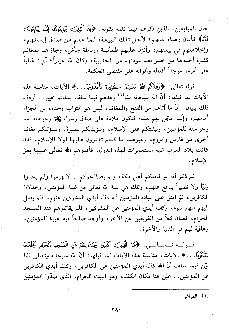 قوله تعالى: {وَعَدَكُمُ اللَّهُ مَغَانِمَ كَثِيرَةً تَأْخُذُونَهَا ...} الآيات، مناسبة هذه الآيات لما قبلها: أنّ الله سبحانه لمّا (¬1) وعدهم فيما سلف بمغانم خيبر .. أردف ذلك ببيان: أنّ ما آتاهم من الفتح والمغانم، ليس هو الثواب وحده، بل الجزاء أمامهم، وإنّما عجّل لهم هذه؛ لتكون علامة على صدق رسوله - صلى الله عليه وسلم - وحياطته له، وحراسته للمؤمنين، وليثبتكم على الإِسلام، وليزيديكم بصيرةً، وسيؤتيكم مغانم أخرى من فارس والروم، وغيرهما ما كنتم تقدرون عليها لولا الإِسلام، فقد كانت بلاد العرب شبه مسستعمرات لهذه الدول، فأقدرهم الله تعالى عليها بعزّ الإِسلام.