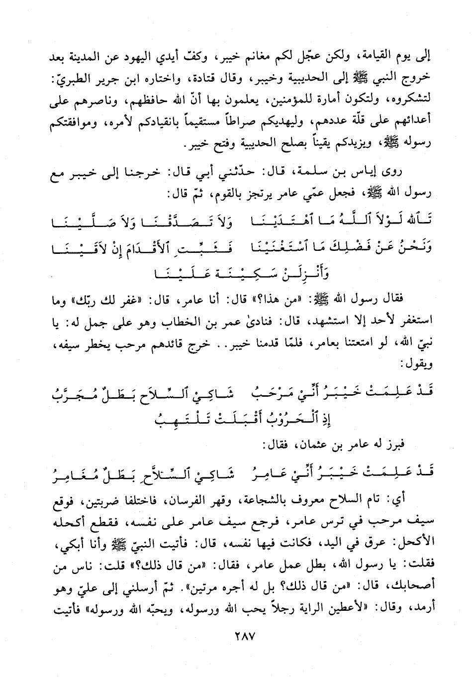 روى إياس بن سلمة، قال: حدّثني أبي قال: خرجنا إلى خيبر مع رسول الله - صلى الله عليه وسلم -، فجعل عمّي عامر يرتجز بالقوم، ثمّ قال:
