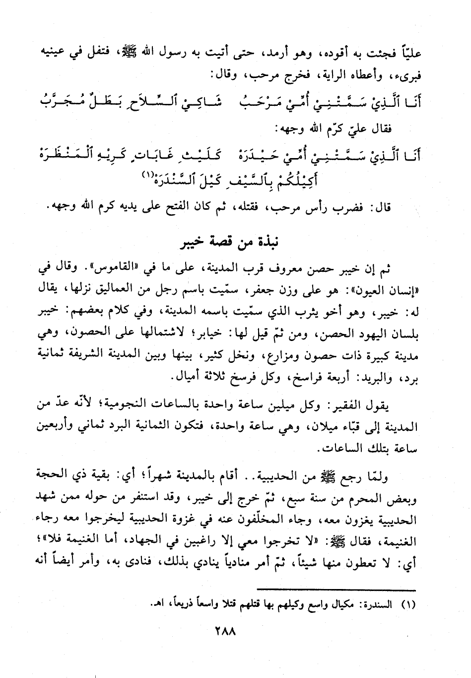 ثم إن خيبر حصن معروف قرب المدينة، على ما في "القاموس". وقال في "إنسان العيون": هو على وزن جعفر، سميت باسم رجل من العماليق نزلها، يقال له: خيبر، وهو أخو يثرب الذي سمّيت باسمه المدينة، وفي كلام بعضهم: خيبر بلسان اليهود الحصين، ومن ثمّ قيل لها: خيابر؛ لاشتمالها على الحصون، وهي مدينة كبيرة ذات حصون ومزارع، ونخل كثير، بينها وبين المدينة الشريفة ثمانية برد، والبريد: أربعة فراسخ، وكل فرسخ ثلاثة أميال.