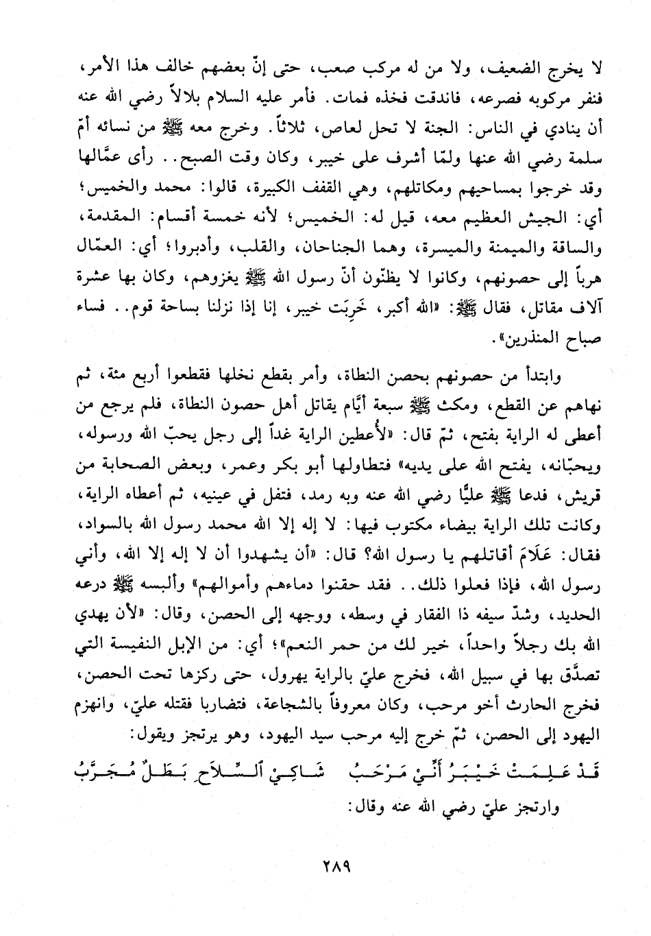 وابتدأ من حصونهم بحصن النطاة، وأمر بقطع نخلها فقطعوا أربع مئة، ثم نهاهم عن القطع، ومكث - صلى الله عليه وسلم - سبعة أيَّام يقاتل أهل حصون النطاة، فلم يرجع من أعطى له الراية بفتح، ثمّ قال: "لأعطين الراية غدًا إلى رجل يحبّ الله ورسوله، ويحبّانه، يفتح الله على يديه" فتطاولها أبو بكر وعمر، وبعض الصحابة من قريش، فدعا - صلى الله عليه وسلم - عليًّا رضي الله عنه وبه رمد، فتفل في عينيه، ثم أعطاه الراية، وكانت تلك الراية بيضاء مكتوب فيها: لا إله إلا الله محمد رسول الله، بالسواد، فقال: عَلَامَ أقاتلهم يا رسول الله؟ قال: "أن يشهدوا أن لا إله إلا الله، وأني رسول الله، فإذا فعلوا ذلك .. فقد حقنوا دماءهم وأموالهم" وألبسه - صلى الله عليه وسلم - درعه الحديد، وشدّ سيفه ذا الفقار في وسطه، ووجهه إلى الحصين، وقال: "لأن يهدي الله بك رجلًا واحدًا، خير لك من حمر النعم"؛ أي: من الإبل النفيسة التي تصدق بها في سبيل الله، فخرج عليّ بالراية يهرول، حتى ركزها تحت الحصن، فخرج الحارث أخو مرحب، وكان معروفًا بالشجاعة، فتضاربا فقتله عليّ، وانهزم اليهود إلى الحصين، ثمّ خرج إليه مرحب سيد اليهود، وهو يرتجز ويقول: