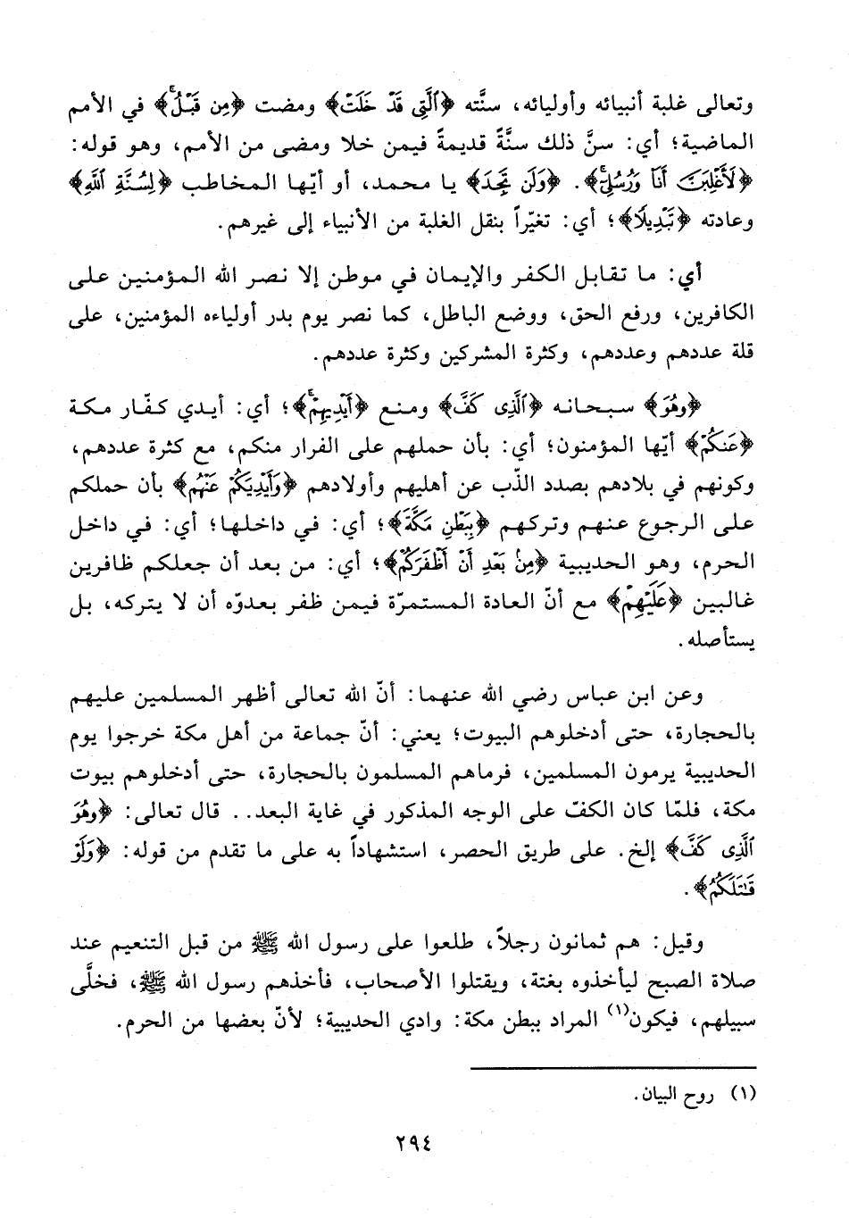 24 - {وَهُوَ} سبحانه {الَّذِي كَفَّ} ومنع {أَيْدِيَهُمْ}؛ أي: أيدي كفّار مكة {عَنْكُمْ} أيّها المؤمنون؛ أي: بأن حملهم على الفرار منكم، مع كثرة عددهم، وكونهم في بلادهم بصدد الذّب عن أهليهم وأولادهم {وَأَيْدِيَكُمْ عَنْهُمْ} بأن حملكم على الرجوع عنهم وتركهم {بِبَطْنِ مَكَّةَ}؛ أي: في داخلها؛ أي: في داخل الحرم، وهو الحديبية {مِنْ بَعْدِ أَنْ أَظْفَرَكُمْ}؛ أي: من بعد أن جعلكم ظافرين غالبين {عَلَيْهِمْ} مع أنّ العادة المستمرّة فيمن ظفر بعدوّه أن لا يتركه، بل يستأصله.