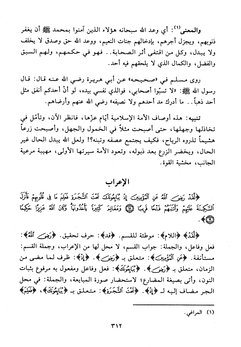 {لَقَدْ} {اللام}: موطئة للقسم. {قَدْ}: حرف تحقيق. {رَضِيَ اللَّهُ}: فعل وفاعل، والجملة: جواب القسم، لا محل لها من الإعراب، وجملة القسم: مستأنفة. {عَنِ الْمُؤْمِنِينَ}: متعلق بـ {رَضِيَ}. {إِذْ}: ظرف لما مضى من الزمان، متعلق بـ {رَضِيَ}. {يُبَايِعُونَكَ}: فعل وفاعل ومفعول به مرفوع يثبات النون، وأتى بصيغة المضارع؛ لاستحضار صورة المبايعة، والجملة: في محل الجر مضاف إليه لـ {إِذْ}. {تَحْتَ الشَّجَرَةِ}: متعلق بـ {يُبَايِعُونَكَ}، {فَعَلِمَ}