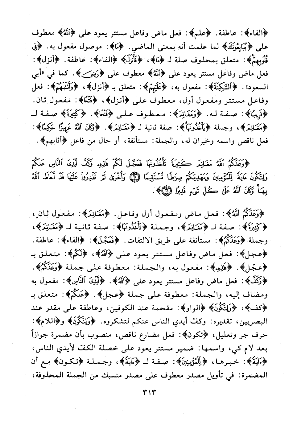 {وَعَدَكُمُ اللَّهُ}: فعل ماض ومفعول أول وفاعل. {مَغَانِمَ}: مفعول ثانٍ، {كَثِيرَةً}: صفة لـ {مَغَانِمَ}، وجملة {تَأْخُذُونَهَا}: صفة ثانية لـ {مَغَانِمَ}، وجملة {وَعَدَكُمُ}: مستأنفة على طريق الالتفات. {فَعَجَّلَ}: {الفاء}: عاطفة. {عَجَّلَ}: فعل ماض وفاعل مستتر يعود على {اللَّهُ}، {لَكُمْ}: متعلق بـ {عَجَّلَ}. {هَذِهِ}: مفعول به، والجملة: معطوفة على جملة {وَعَدَكُمُ}. {وَكَفَّ}: فعل ماض وفاعل مستتر يعود على {اللَّهُ}. {أَيْدِيَ النَّاسِ}: مفعول به ومضاف إليه، والجملة: معطوفة على جملة {عَجَّلَ}. {عَنْكُمْ}: متعلق بـ {كَفَّ}، {وَلِتَكُونَ} {الواو}: مقحمة عند الكوفين، وعاطفة على مقدر عند البصريين، تقديره: وكفّ أيدي الناس عنكم لتشكروه. {وَلِتَكُونَ} و {اللام}: حرف جر وتعليل، {تكون}: فعل مضارع ناقص، منصوب بأن مضمرة جوازًا بعد لام كي، واسمها: ضمير مستتر يعود على خصلة الكفّ لأيدي الناس، {آيَةً}: خبرها، {لِلْمُؤْمِنِينَ}: صفة لـ {آيَةً}، وجملة {تكون} مع أن المضمرة: في تأويل مصدر معطوف على مصدر منسبك من الجملة المحذوفة،