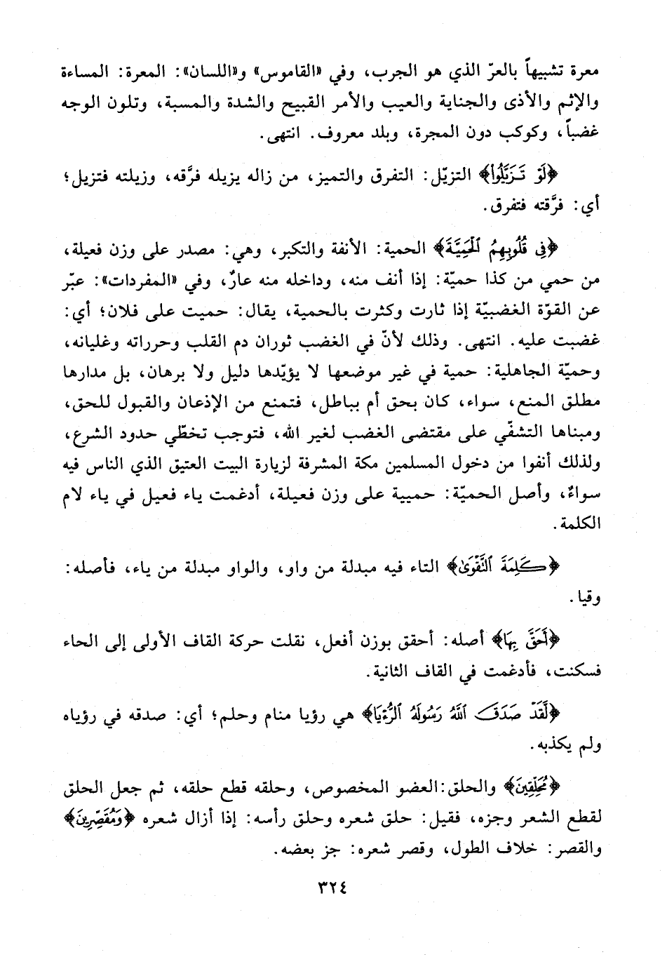 {فِي قُلُوبِهِمُ الْحَمِيَّةَ} الحمية: الأنفة والتكبر، وهي: مصدر على وزن فعيلة، من حمي من كذا حمتة: إذا أنف منه، وداخله منه عارٌ، وفي "المفردات": عبّر عن القوّة الغضبيّة إذا ثارت وكثرت بالحمية، يقال: حميت على فلان؛ أي: غضبت عليه. انتهى. وذلك لأنّ في الغضب ثوران دم القلب وحرراته وغليانه، وحميّة الجاهلية: حمية في غير موضعها لا يؤيّدها دليل ولا برهان، بل مدارها مطلق المنع، سواء، كان بحق أم بباطل، فتمنع من الإذعان والقبول للحق، ومبناها التشفّي على مقتضى الغضب لغير الله، فتوجب تخطّي حدود الشرع، ولذلك أنفوا من دخول المسلمين مكة المشرفة لزيارة البيت العتيق الذي الناس فيه سواءٌ, وأصل الحميّة: حميية على وزن فعيلة، أدغمت ياء فعيل في ياء لام الكلمة.