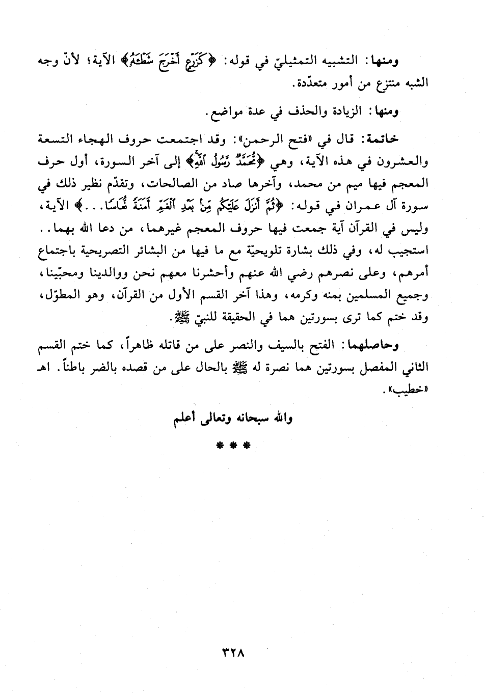 خاتمة: قال في "فتح الرحمن": وقد اجتمعت حروف الهجاء التسعة والعشرون في هذه الآية، وهي {مُحَمَّدٌ رَسُولُ اللَّهِ} إلى آخر السورة، أول حرف المعجم فيها ميم من محمد، وآخرها صاد من الصالحات، وتقدّم نظير ذلك في سورة آل عمران في قوله: {ثُمَّ أَنْزَلَ عَلَيْكُمْ مِنْ بَعْدِ الْغَمِّ أَمَنَةً نُعَاسًا ...} الآية، وليس في القرآن آية جمعت فيها حروف المعجم غيرهما، من دعا الله بهما .. استجيب له، وفي ذلك بشارة تلويحيّة مع ما فيها من البشائر التصريحية باجتماع أمرهم، وعلى نصرهم رضي الله عنهم وأحشرنا معهم نحن ووالدينا ومحبّينا، وجميع المسلمين بمنه وكرمه، وهذا آخر القسم الأول من القرآن، وهو المطوّل، وقد ختم كما ترى بسورتين هما في الحقيقة للنبيّ - صلى الله عليه وسلم -.