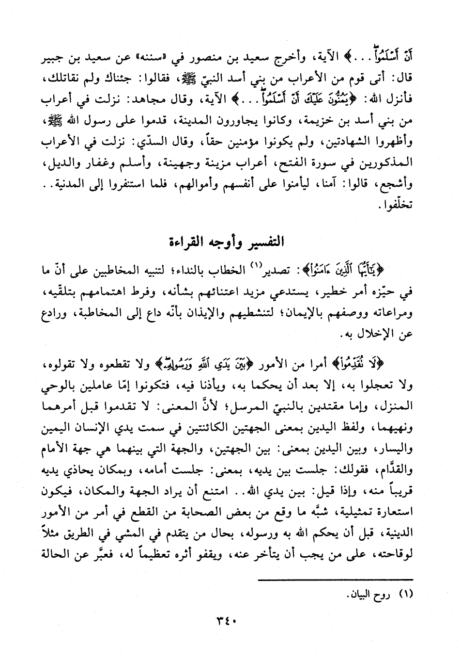 {لَا تُقَدِّمُوا} أمرا من الأمور {بَيْنَ يَدَيِ اللَّهِ وَرَسُولِهِ} ولا تقطعوه ولا تقولوه، ولا تعجلوا به، إلا بعد أن يحكما به، ويأذنا فيه، فتكونوا إمّا عاملين بالوحي المنزل، وإما مقتدين بالنبيّ المرسل؛ لأنَّ المعنى: لا تقدموا قبل أمرهما ونهيهما, ولفظ اليدين بمعنى الجهتين الكائنتين في سمت يدي الإنسان اليمين واليسار، وبين اليدين بمعنى: بين الجهتين، والجهة التي بينهما هي جهة الأمام والقدَّام، فقولك: جلست بين يديه، بمعنى: جلست أمامه، وبمكان يحاذي يديه قريبًا منه، وإذا قيل: بين يدي الله .. امتنع أن يراد الجهة والمكان، فيكون استعارة تمثيلية، شبَّه ما وقع من بعض الصحابة من القطع في أمر من الأمور الدينية، قبل أن يحكم الله به ورسوله، بحال من يتقدم في المشي في الطريق مثلًا لوقاحته، على من يجب أن يتأخر عنه، ويقفو أثره تعظيمًا له، فعبَّر عن الحالة