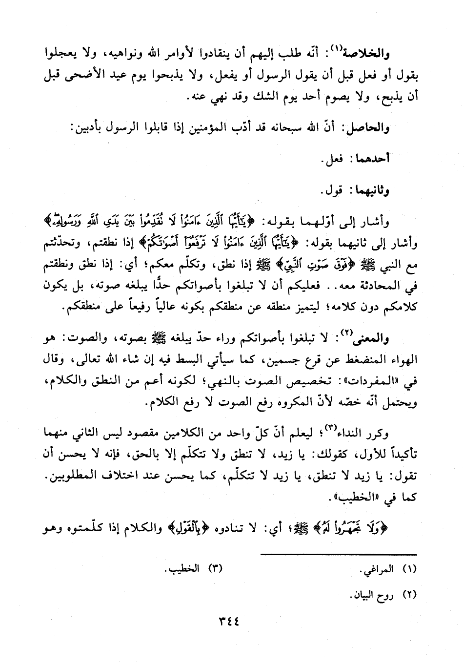 وأشار إلى أوّلهما بقوله: {يَا أَيُّهَا الَّذِينَ آمَنُوا لَا تُقَدِّمُوا بَيْنَ يَدَيِ اللَّهِ وَرَسُولِهِ} وأشار إلى ثانيهما بقوله: {يَا أَيُّهَا الَّذِينَ آمَنُوا لَا تَرْفَعُوا أَصْوَاتَكُمْ} وإذا نطقتم، وتحدّثتم مع النبي - صلى الله عليه وسلم - {فَوْقَ صَوْتِ النَّبِيِّ} - صلى الله عليه وسلم - إذا نطق، وتكلّم معكم؛ أي: إذا نطق ونطقتم في المحادثة معه .. فعليكم أن لا تبلغوا بأصواتكم حدًّا يبلغه صوته، بل يكون كلامكم دون كلامه؛ ليتميز منطقه عن منطقكم بكونه عاليًا رفيعًا على منطقكم.