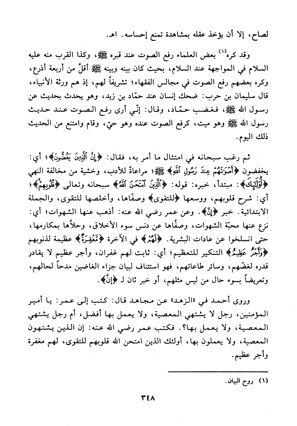 3 - ثم رغب سبحانه في امتثال ما أمر به، فقال: {إِنَّ الَّذِينَ يَغُضُّونَ}؛ أي: يخفضون {أَصْوَاتَهُمْ عِنْدَ رَسُولِ اللَّهِ} - صلى الله عليه وسلم -؛ مراعاةً للأدب، وخشية من مخالفة النهي {أُولَئِكَ}: مبتدأ، خبره: قوله: {الَّذِينَ امْتَحَنَ اللَّهُ} سبحانه وتعالى {قُلُوبَهُمْ}؛ أي: شرح قلوبهم، ووسعها {لِلتَّقْوَى} وصفّاها، وأخلصها للتقوى، والجملة الابتدائية. خبر {إِنَّ}. وعن عمر رضي الله عنه: أذهب عنها الشهوات؛ أي: نزع عنها محبّة الشهوات، وصفَّاها عن دنس سوء الأخلاق، وحلَّاها بمكارمها، حتى انسلخوا عن عادات البشرية. {لَهُمْ} في الآخرة {مَغْفِرَةٌ} عظيمة لذنوبهم {وَأَجْرٌ عَظِيمٌ} التنكير للتعظيم؛ أي: ثابت لهم غفران، وأجر عظيم لا يقادر قدره لغضّهم، وسائر طاعاتهم، فهو استئناف لبيان جزاء الغاضين مدحًا لحالهم، وتعريضًا بسوء حال من ليس مثلهم، أو خبر ثان لـ {إِنَّ}.